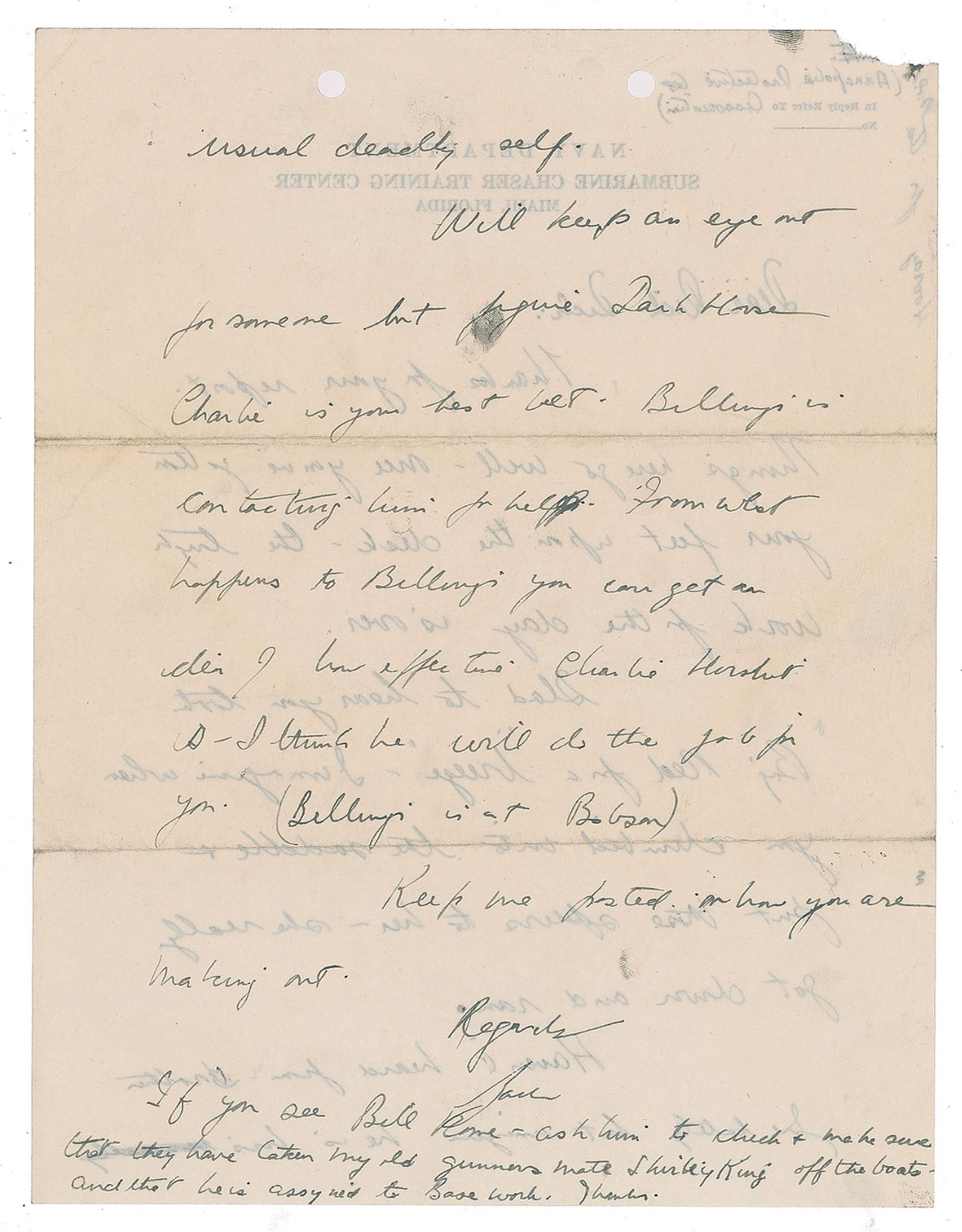 ALS signed “Jack,” one page both sides, 8 x 10.5, Navy Department, Submarine Chaser Training Center letterhead, no date but circa March 1944. Letter to his friend Richard Flood in Newport, Rhode Island, written just eight months after the destruction of the PT-109 torpedo boat. Kennedy makes reference to his older brother, Joseph P. Kennedy, Jr., who was flying missions in Europe and would tragically be killed five months later when his plane exploded prematurely. In part: "Thanks for your report. Things here go well—once you've gotten your feet upon the desk—the tough work of the day is over. Glad to hear you took 'Big Red' for a 'breeze'—I imagine when you climbed into the saddle & put the spurs to her—she really got down and ran. Haven't heard from Brother Joe lately but imagine he is his usual deadly self. Will keep an eye out for someone but figure Dark Horse Charlie is your best bet. Billings is contacting him for help. From what happens to Billings you can get an idea of how effective Charlie…is—I think he will do the job for you. (Billings is at Boston). Keep me posted how you are making out." He adds a postscript, "If you see Bill Rome—ask him to check & make sure that they have taken my old gunners mate Shirley King off the boats—and that he is assigned to base work." In the upper right corner of the first page, Kennedy writes: "Hooray for the A.P.A. (Annapolis Protective Association)." In very good to fine condition, with creasing, several horizontal folds, and minor paper loss to the upper left corner. Accompanied by a photocopy of the original mailing envelope (see lot 23).