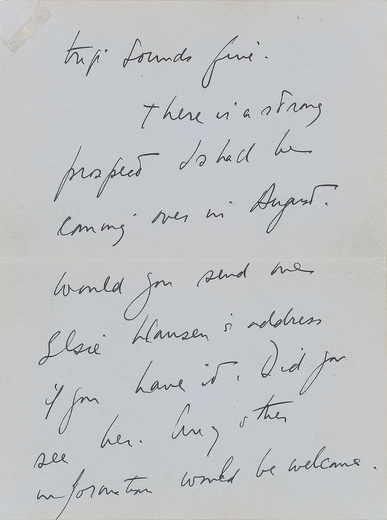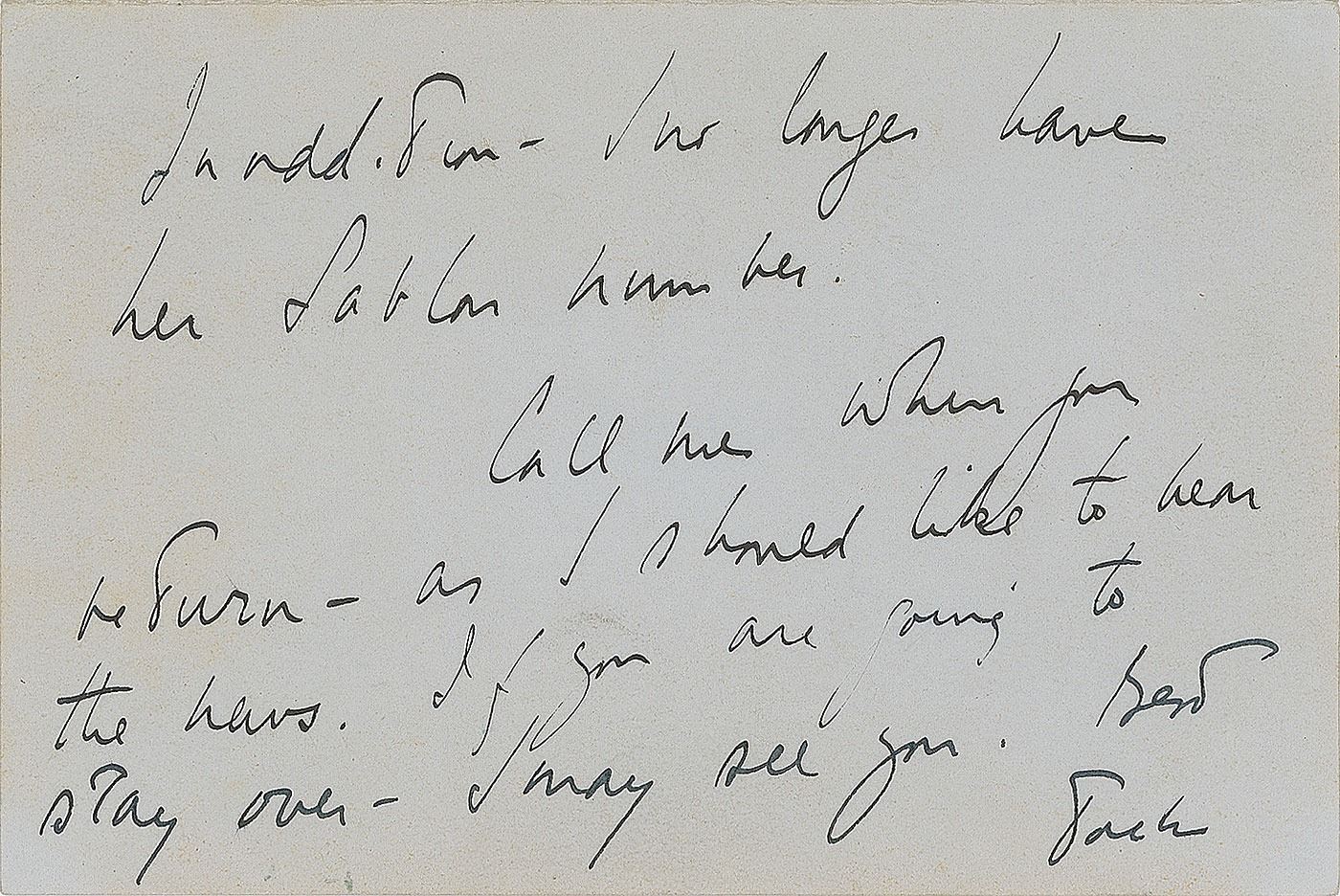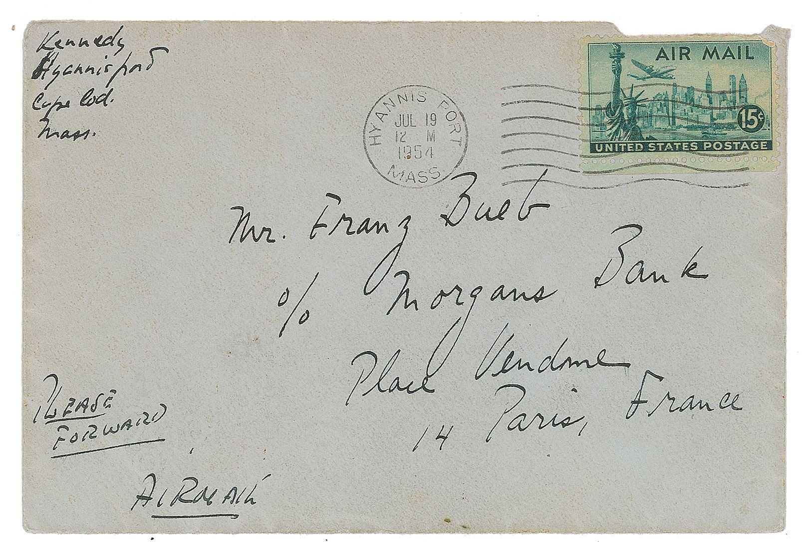 ALS signed “Jack,” three pages on two adjoining sheets, 5.75 x 3.75, Jacqueline Kennedy's personal stationery letterhead, postmarked Hyannis Port, July 19, 1954. Letter to German-born artist Franz Bueb in Paris, France, in full: "I have been receiving your cards. The trip sounds fine. There is a strong prospect I shall be coming over in August. Would you send me Elsie Hansen's address if you have it. Did you see her. Any other information would be welcome. In addition—I no longer have her Sablon number. Call me when you return—as I should like to hear the news. If you are going to stay over—I may see you." In fine condition, with a small tape remnant to one blank corner. Accompanied by the original mailing envelope addressed in Kennedy's hand, incorporating his surname in the return address field, "Kennedy, Hyannisport, Cape Cod, Mass."