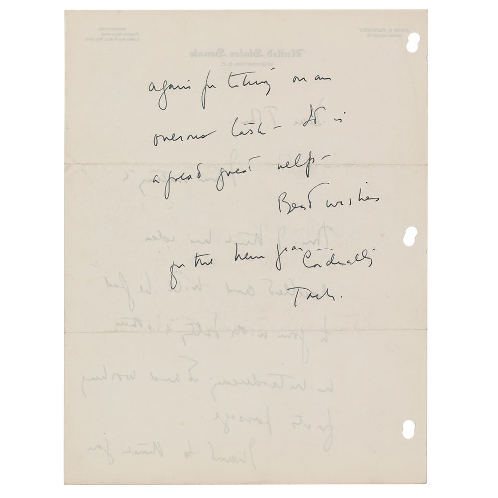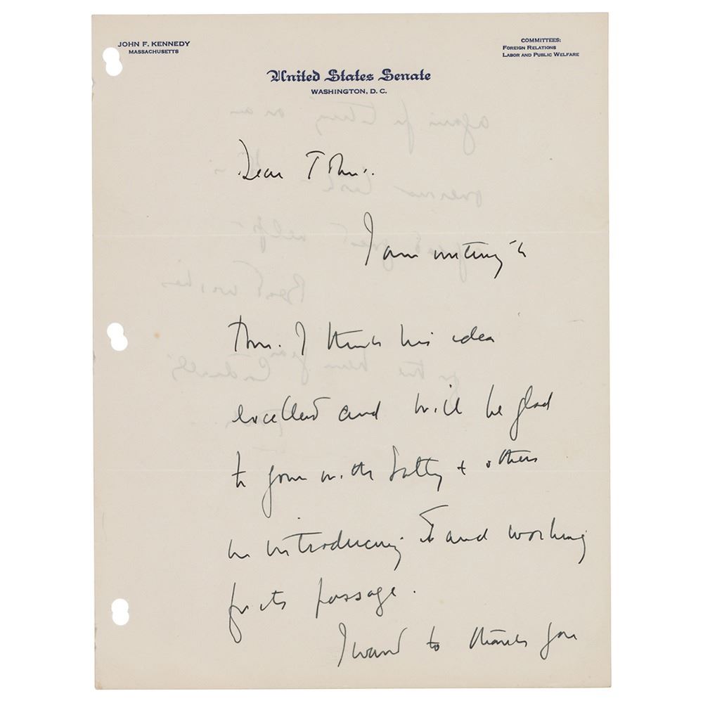 ALS signed ‰ÛÏJack,‰Û one page both sides, 8 x 10.5, personal United States Senate letterhead, 1958/1959. Handwritten letter to Democratic majority leader of the Senate John McCormack, addressing a willingness and enthusiasm to introduce a bill they were working on with "Salty," Massachusetts Governor Leverett Saltonstall, in full: "I am writing to Tom. I think his idea excellent and will be glad to form with Salty + others in introducing it and working for its passage. I want to thank you again for taking on an onerous task‰ÛÓIt is a great great help‰ÛÓBest wishes for the New Year." In fine condition, with punch holes to the left edge.