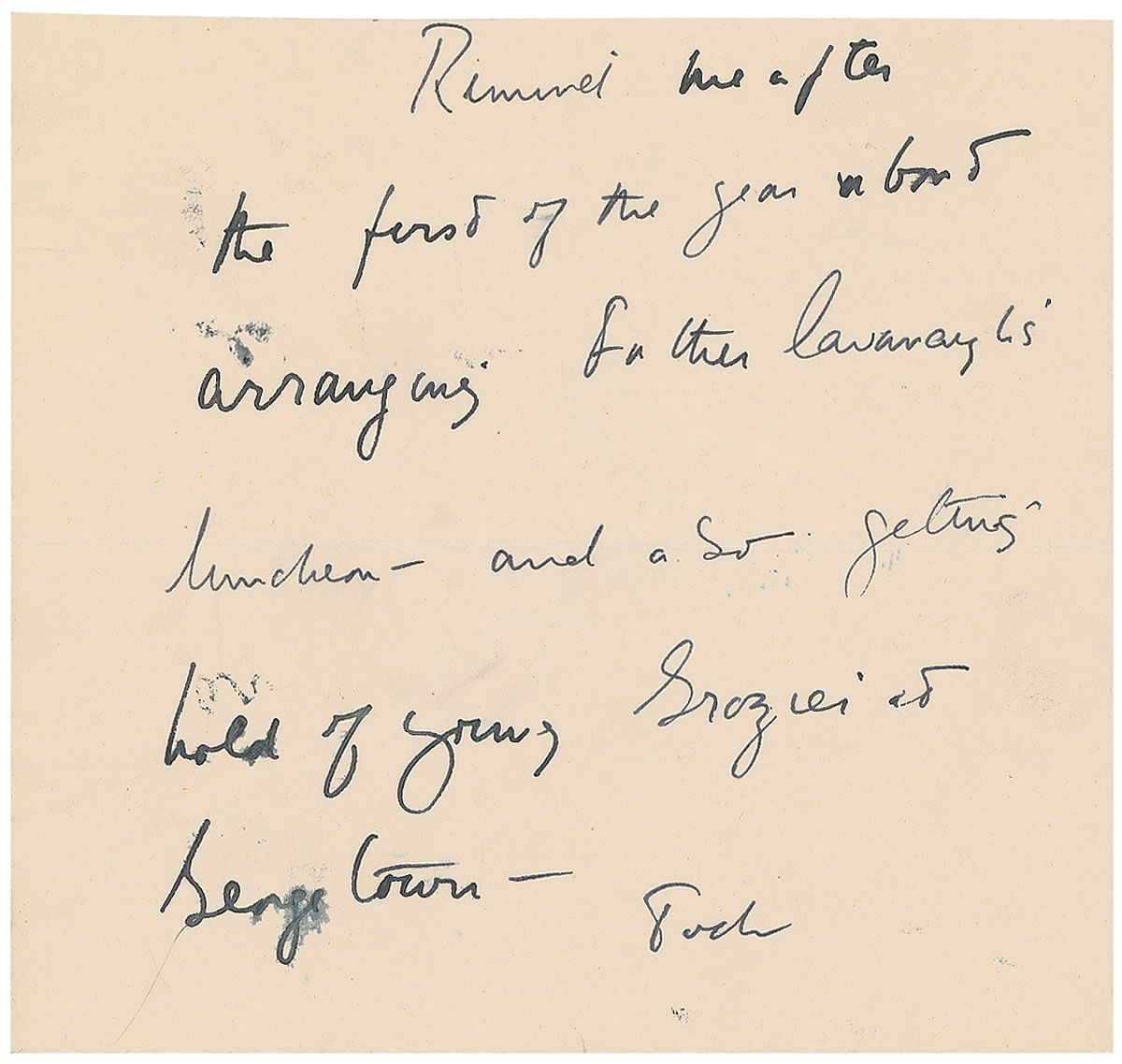 ANS signed “Jack,” one page, 6.25 x 5.75, no date. Note to friend and confidante Dave Powers. In full: “Remind me after the first of the year about arranging Father Cavanaugh’s luncheon—and also getting hold of young Grozier at Georgetown.” In fine condition, with a central horizontal fold resulting in some brushing to ink on left side. Father Cavanaugh was the personal priest of the Kennedy family and a longtime friend of Joe Kennedy.