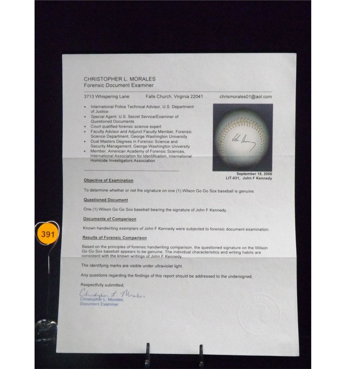 John F. Kennedy Autographed Baseball. Wilson "GO GO SOX" Official League Ball. Appraised or estimated retail value $10,000. COA by Christopher Morales. All Sales Final. Please see terms and conditions of auction.