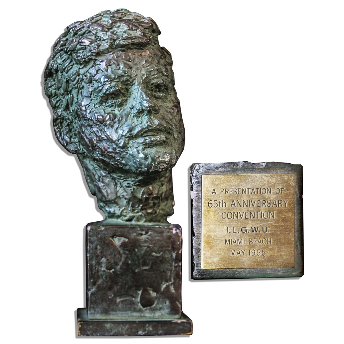 Rare John F. Kennedy bust sculpture trophy given at the International Ladies Garment Workers Union convention in 1965, shortly after he signed the Minimum Wage Act. Sculpture by Robert Berks is made of plaster and painted a dark green, mounted at an asymmetrical angle. An engraved brass plaque on the back of the base reads ''A Presentation of / 65th Anniversary / Convention / ILGWU / Miami Beach / May 1965''. Measures 8.75'' in total height on a 3'' square base. Weighs 3 pounds, 1 ounce. Scattered minor chipping to surface and wear to base edges and corners, else near fine. A very rare JFK sculpture by Robert Berks, who also designed a similar sculpture of Robert Kennedy.