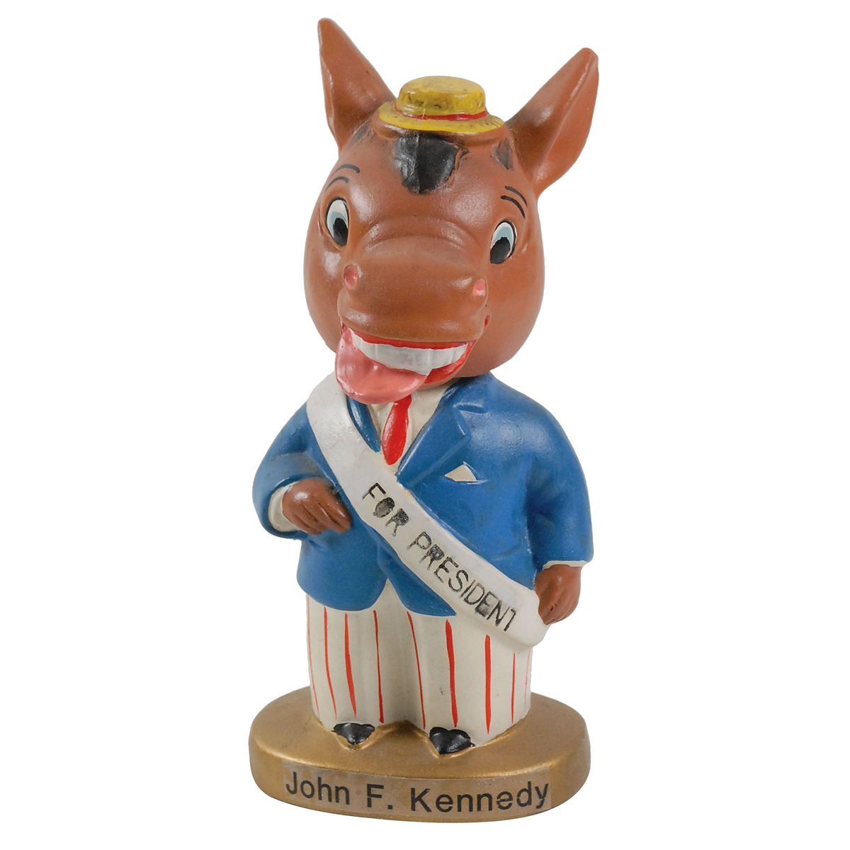 Uncommon Kennedy presidential campaign bobblehead from 1960. Plaster of Paris bobblehead measures almost 8? tall with a Western Commerce Corp label affixed to the bottom of the base and shows a donkey dressed in a blue jacket, red and white striped pants, and a yellow hat wearing a campaign sash, with a label affixed to the base which reads, “John F. Kennedy.” In fine condition.