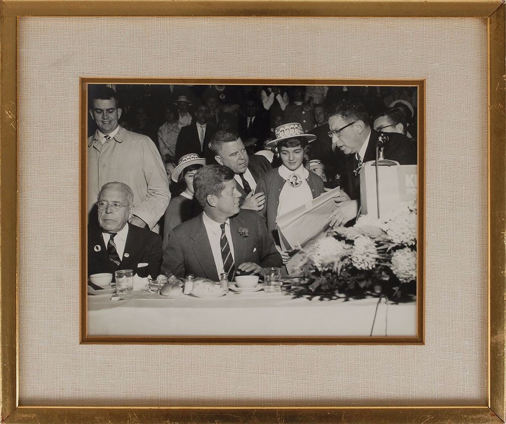 Sharp original glossy 9.25 x 7.25 photo of Kennedy at a reception during his 1960 presidential campaign, showing him talking to a young supporter wearing a Kennedy hat and button. Cloth-matted and framed. In fine condition.