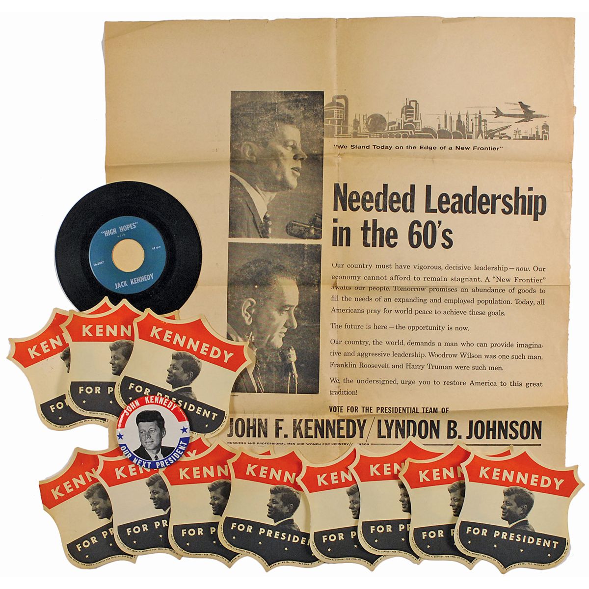 Collection of 14 campaign items consisting of: a 3.5? red, white, and blue campaign photo button; a 21 x 24 campaign poster issued by the Business and Professional Men and Women for Kennedy/Johnson; a 45 rpm record for ‘All the Way / High Hopes,’ with Jack Kennedy; and eleven red, white, and blue ‘Kennedy for President’ badge-shaped campaign handbills. In fine condition, with a few small separations along poster storage folds, and some light toning to handbills.
