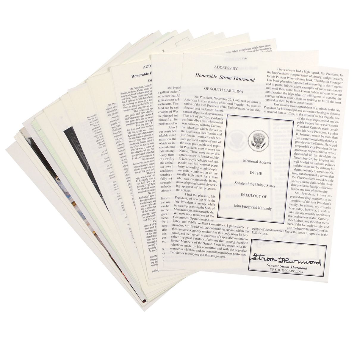 Collection of 36 items, consisting primarily of souvenir typescripts and letters, each signed by someone involved in honoring the memory of Kennedy, including many memorial address souvenir typescripts by members of Congress and a few firsthand accounts. A number are also related to the trial of Mac Wallace. Signers are: Bradford C. Boyd, Jack B. Brooks, Robert C. Byrd (4), Douglas Caddy (3), Richard Cardinal Cushing, Douglas Dillon, W. O. ‘Pete’ Edgar, Henry B. Gonzalez (4), Philip M. Hannan (7), Mike Mansfield, Barr McClellan, L. E. Noblitt, George A. Smathers (4), Strom Thurmond, and James C. Wright, Jr. (5). In overall fine condition.
