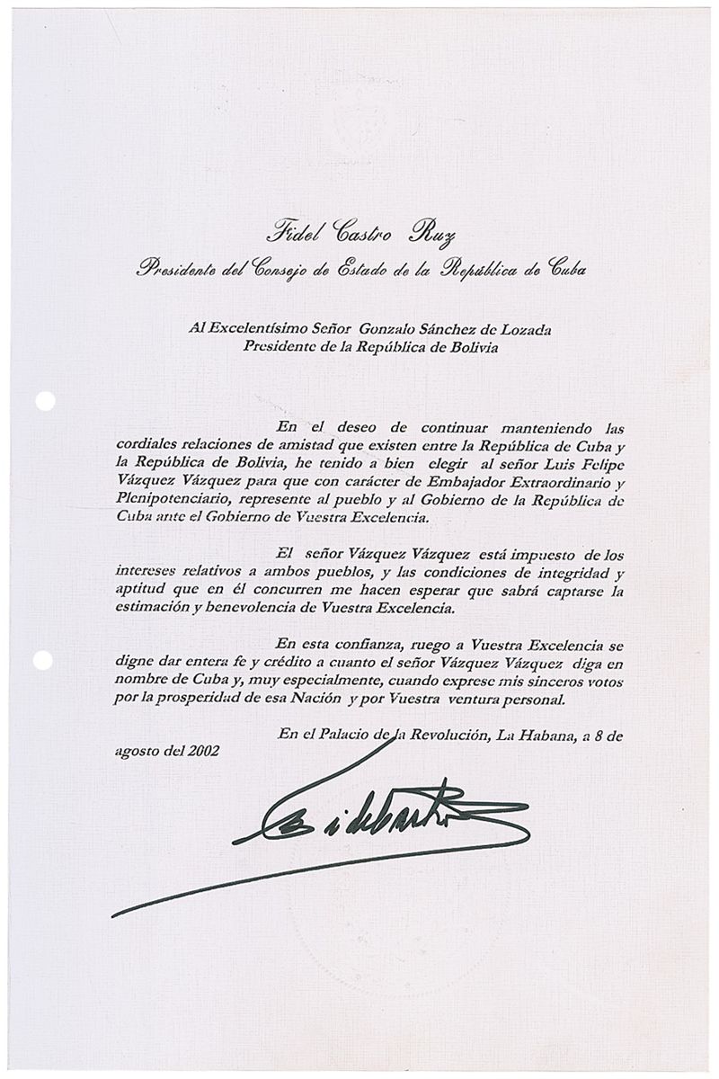DS, signed by Fidel Castro, one page, 8.5 x 13, August 8, 2002. Document issued to Gonzalo Sanchez, President of the Republic of Bolivia. The document reads in full, "With the wish to continue the maintenance of the cordial, friendly relations that exist between the Republic of Cuba and the Republic of Bolivia, I have chosen Mister Luis Felipe Vazquez Vazquez to represent the people and the government of the Republic of Cuba as Extraordinary, Fully- Empowered Ambassador in front of the Government of Your Excellency. Mr. Vazquez Vazquez is tasked with supporting the interest of both countries; the integrity and aptitude that he exhibits allow me to hope that he will gain the esteem and the kindness of Your Excellency. With this confidence, I beg Your Excellency to extend full faith and credit to what Mr. Vazquez Vazquez will say in the name of Cuba and, most importantly, when he will express my sincere wishes for the prosperity of this Country and for Your personal happiness. In the Palace of the Revolution, Havana, on August 8, 2002."