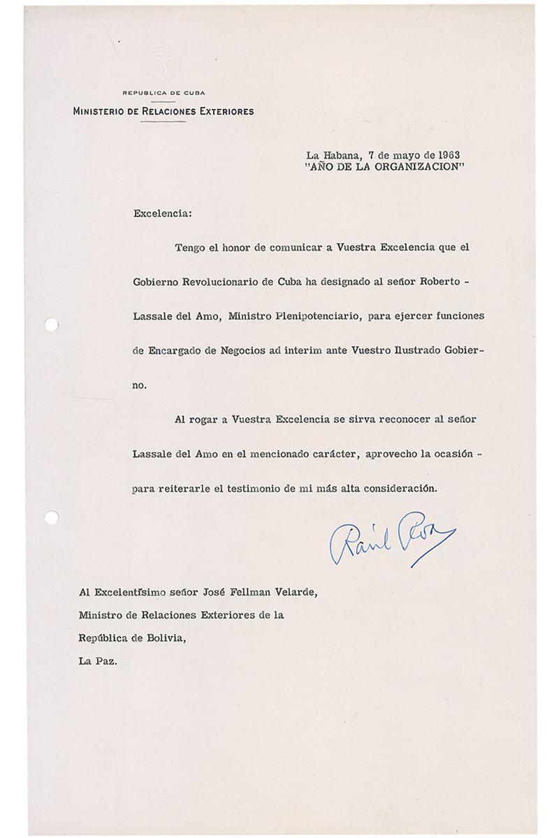 DS, signed “Raul Cruz,” one page, 8.5 x 13.5, May 7, 1963, the "year of reorganization.” Addressed to Jose Fellman Velarde, the Minister of Foreign Relations of Bolivia. The document reads in full, "Your Excellency: I have the honor to advise Your Excellency that the Revolutionary Government of Cuba has designated Mr. Roberto Lassale del Amo, Fully-Empowered Minister, to fill the position of Business Chief at interim for your Esteemed Government. I ask that your Excellency accept Mr. Lassale del Amo in the role above mentioned and I take this opportunity to reiterate the assurance of my highest respect."