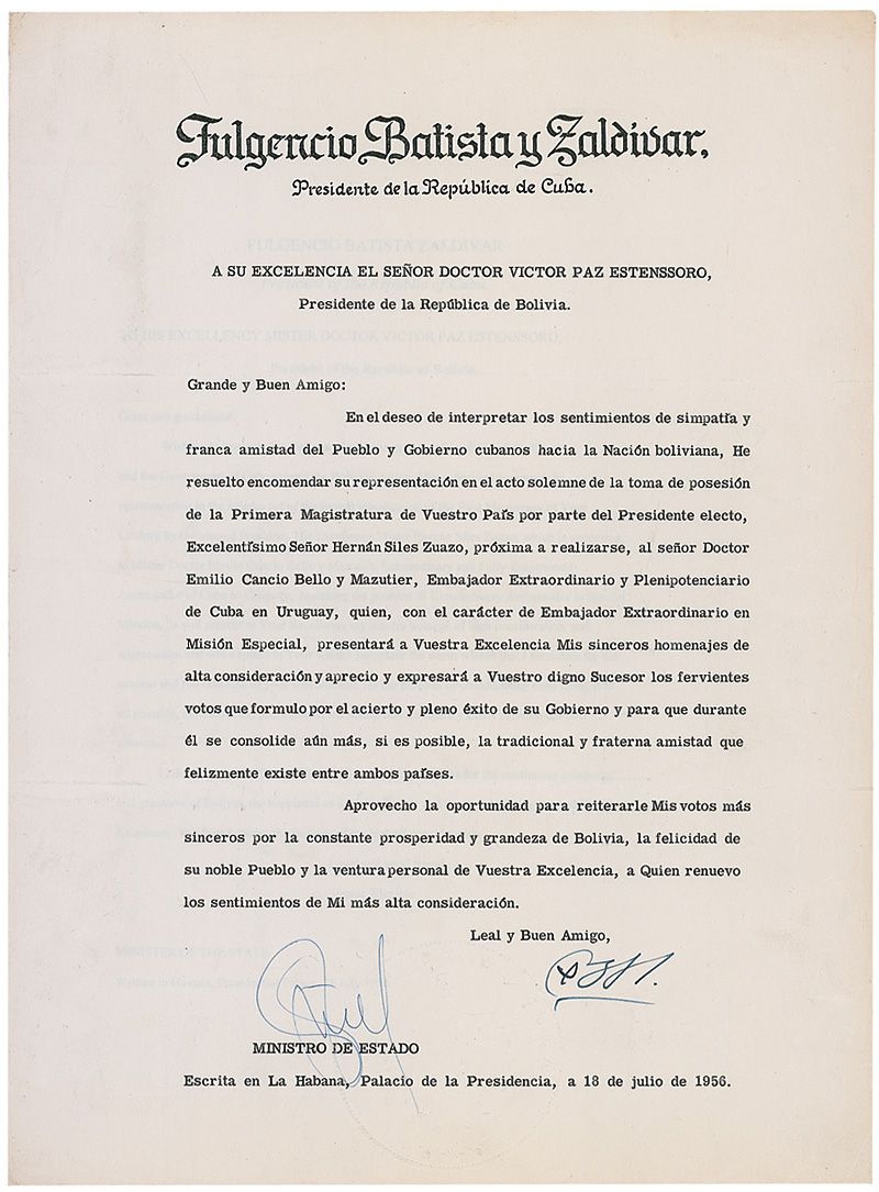 The earliest document in this archive is a July 18, 1956, document by Fulgencio Batista addressed to Victor Paz Estenssoro, President of the Republic of Bolivia. The document was written in Havana at the Presidential Palace on July 18, 1956, and reads in part, "Wishing to interpret the feelings of affection and true friendship of the People and the Government of Cuba toward the Bolivian nation, I have decided to entrust its representation in the solemn act of the formal introduction of the First Magistracy of Your Country by the elected President, His Excellency Mister Hernan Siles Zuazo, which is upcoming, to Mister Doctor Emilio Cancio Bello y Mazutier, Extraordinary and Fully-Empowered Ambassador of Cuba to Uruguay; assuming the position of Extraordinary Ambassador in Special Mission, he will present to Your Excellency my sincere homage of high consideration and appreciation and will express to Your worthy successor the warm wishes that I formulate for the success and full outcome of your Government, for the purpose of consolidating even more, if at all possible, the traditional and fraternal friendship that fortunately exists between our two countries . . ." The document is signed by Batista and the Minister of State.