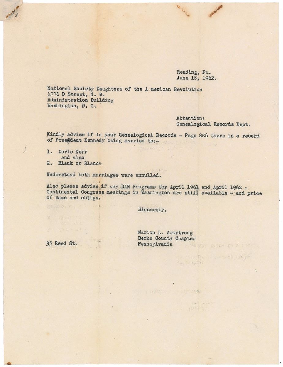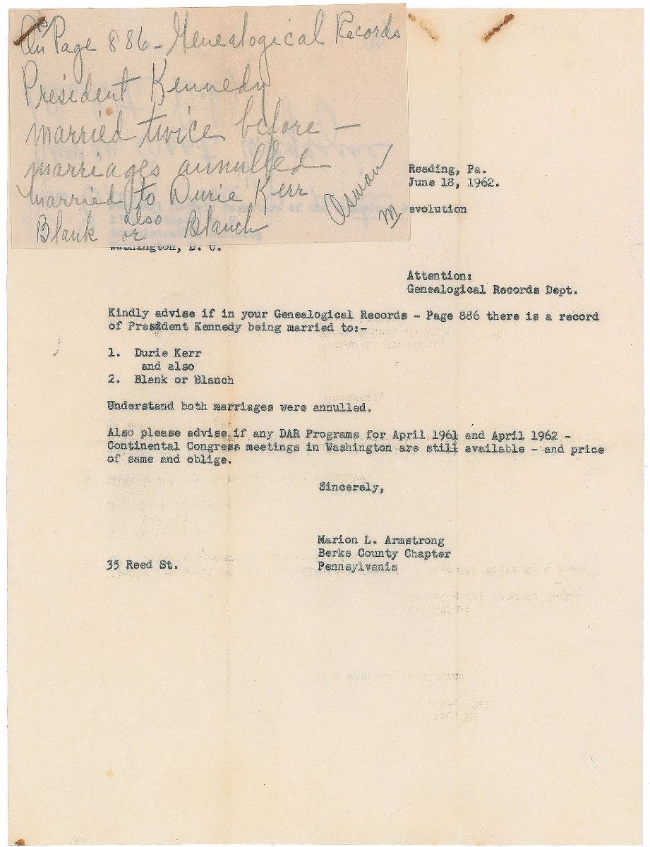 Typed letter, one onionskin page, 8 x 10.5, June 18, 1962. Letter sent from the Berks County Chapter of the Daughters of the American Revolution to the National Society DAR in Washington. In full: “Kindly advise if in your Genealogical Records—Page 886 there is a record of President Kennedy being married to:—1. Durie Kerr and also 2. Blank or Blanch. Understand both marriages were annulled.” A penciled note stapled to the upper left denotes a related page number in their genealogical records. In fine condition, with rusty staple marks at top.