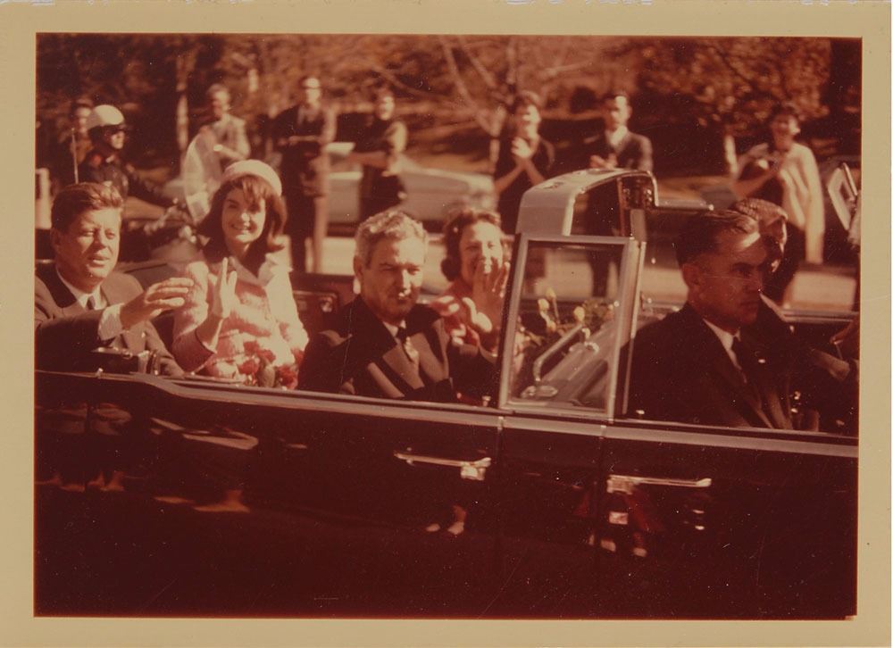 Original vintage color semi-glossy 6.5 x 4.25 photo of President John F. Kennedy, Jackie Kennedy, Governor John B. Connally, and Nellie Connally waving to the crowd during the Dallas motorcade on November 22, 1963. Secret Service agent Roy Kellerman is clearly seen surveying the crowd ahead, as is driver Will Greer. Displayed in its original folder. In fine condition.