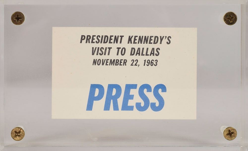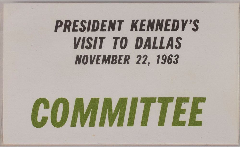 Pair of original cardstock ‘Texas Welcome Committee’ badges, 3.5 x 2.25, both reading "President Kennedy’s Visit to Dallas, November 22, 1963," with one marked "Press" in blue lettering and "No. 268" on the reverse, and the other marked "Committee" in green lettering and "No. 1017" on the reverse. The "Press" badge is displayed in an acrylic screwdown holder, and the "Committee" badge is in its plastic pinback holder. In fine condition. These "Committee" badges were given to members of the ‘Texas Welcome Committee’ who were to greet Kennedy upon his arrival at the Dallas Trade Mart, while the "Press" badges were for members of the media covering the visit.