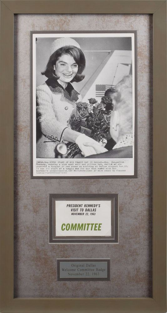 Original cardstock badge given to members of the ‘Texas Welcome Committee’ who were to greet Kennedy upon his arrival at the Dallas Trade Mart, reading, “President Kennedy’s Visit to Dallas, November 22, 1963, Committee," 3.5 x 2.25, marked “No. 1333” on the reverse. Includes an original vintage glossy 6.25 x 9 AP wirephoto of Jacqueline Kennedy at the beginning of their tragic day in Dallas. Matted and framed together to an overall size of 10.5 x 20, with a window in the backing for viewing the reverse of the badge. In fine condition. This example of the "Committee" badge was given to Jane D. Wooley and is accompanied by a copy of a letter of provenance from her.