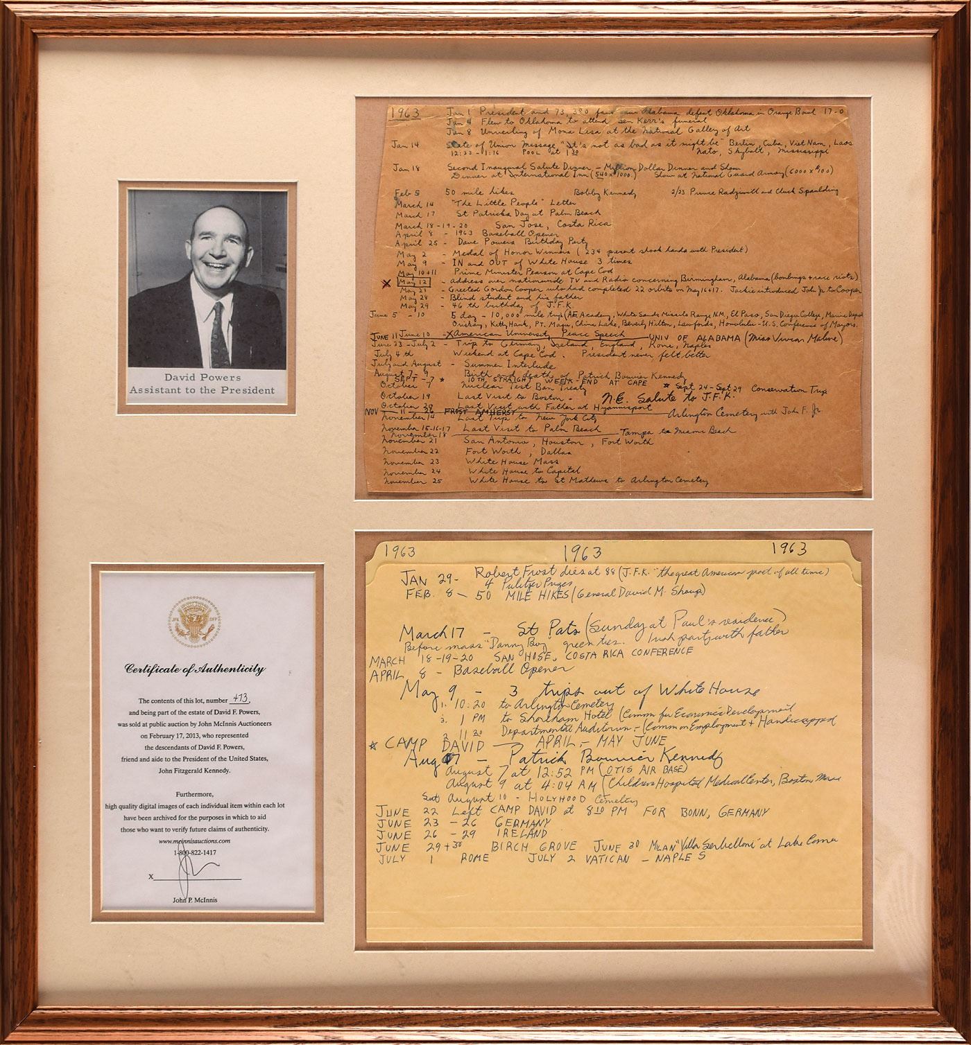 Special assistant and close friend to John F. Kennedy (1912–1998), who was responsible for recording the 'Powers film' that captured the last moments before the president's assassination. Two pages of handwritten notes from the estate of Kennedy's friend and special assistant David Powers, comprising one toned 11.75 x 9 sheet and one 11.75 x 9.5 manila folder, containing timelines of the tragic year of 1963. The first lists dates from January 1st through November 25th, with interesting content including: "Jan 1: President and 73,380 fans saw Alabama defeat Oklahoma in Orange Bowl 17-0…Jan 8: Unveiling of Mona Lisa at the National Gallery of Art…Jan 14: State of Union Message 'It's not as bad as it might be,' Berlin, Cuba, Vietnam, Laos, Nato…Feb 5: 50 mile hikes, Bobby Kennedy…March 17: St. Patrick's Day at Palm Beach…May 9: In and Out of White House 3 times…May 12: Address over nationwide TV and Radio concerning Birmingham, Alabama (bombings & race riots)…May 21: Greeted Gordon Cooper who had completed 22 orbits on May 16 & 17. Jackie introduced John Jr. to Cooper…May 29: 46th birthday of J.F.K….June 23–July 2: Trip to Germany, Ireland, England, Rome, Naples…July 4th: Weekend at Cape Cod. President never felt better…October 7: Nuclear Test Ban Treaty…October 19: Last Visit to Boston…October 20: Last Visit with Father at Hyannisport…November 22: Fort Worth, Dallas…November 23: White House Mass…November 24: White House to Capital…November 25: White House to St. Mathews to Arlington Cemetery." The notes on the manila folder list several of the same events, with the dates constrained to January 29–July 2. Mounted, matted, and framed with an image of Powers and a certificate of authenticity from the sale of his estate to an overall size of 23 x 25. In fine condition.
