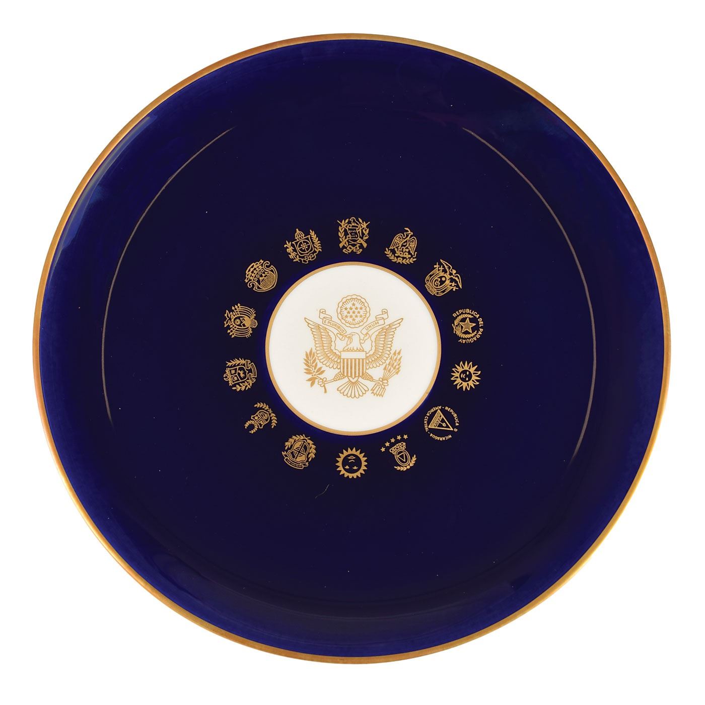 Beautiful deep cobalt blue dinner plate produced especially for the ‘Dinner of the Inter-American Press Association in honor of President John Fitzgerald Kennedy,’ held at the Hotel Americana in Miami Beach on November 18, 1963, just four days before JFK’s assassination. The plate measures approximately 10.5˝ in diameter, and features gilt edging and ornamentation of the presidential seal, as well as the coats of arms of the IAPA’s 14 member states. The manufacturer's imprint on the cream underside reads, “Syracuse - China - 93 G U.S.A.” In fine condition. Accompanied by a packet containing copies of several photographs of the event and a transcript of the address Kennedy gave.