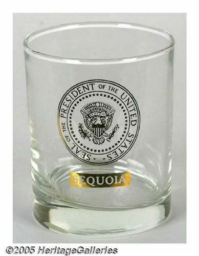 <B>John F. Kennedy Engraved Glass from the Presidential Yacht, "U.S.S. Sequoia"</B></I> President Kennedy enjoyed boating and sailing throughout his entire life. After being elected President in 1960, he spent many hours aboard the <I>U.S.S. Sequoia,</B></I> the Presidential yacht. This nice gold decorated tumbler from the <I>U.S.S. Sequoia</B></I> has the added benefit of being hand-engraved "John F. Kennedy," making it the President's personal glass while aboard. This glass was last used by the President on May 29, 1963 in what turned out to be his last birthday celebration. White House maid Lillian Rogers Parks reminisced about her time with the Kennedys and provided insight about the glass in a signed engraved White House card which will accompany the tumbler. Lot:255