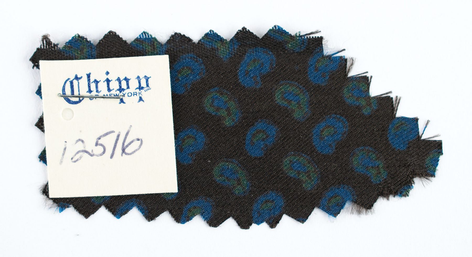 John F. Kennedy's personally-owned sample of patterned fabric (No. 12516), measuring 3.25 x 1.5, sent at his request by Chipp of 14 East 44th Street. In fine condition. Accompanied by a photocopy of a letter of provenance from JFK's personal secretary Evelyn Lincoln to noted collector Robert L. White, stating that he ultimately chose material no. B2620 to have a shirt made. Originates from the Robert L. White collection.