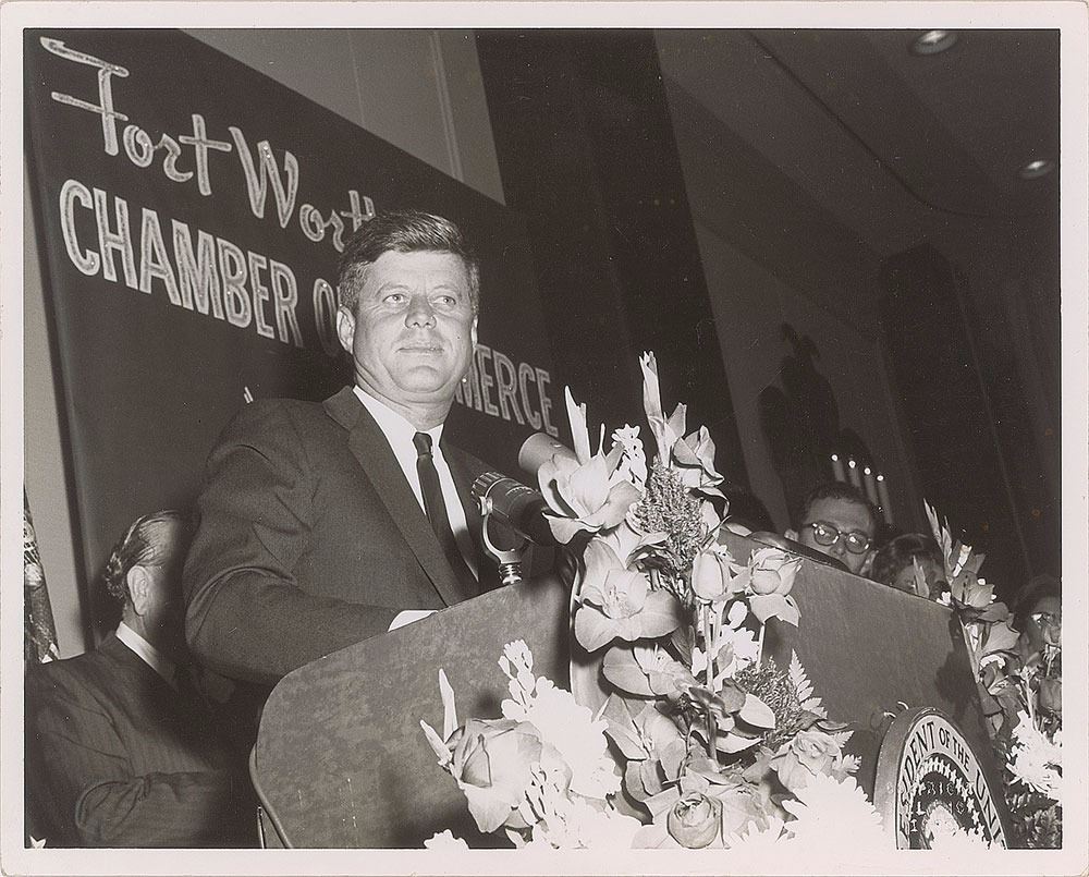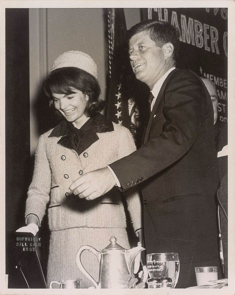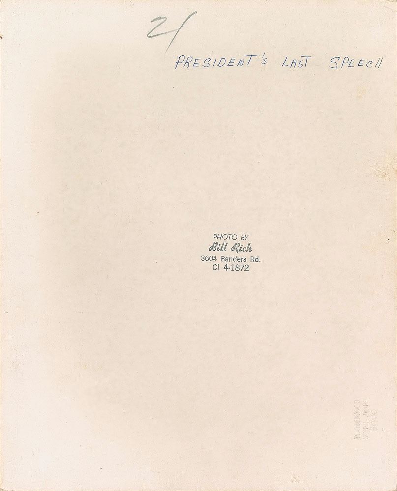 Two original matte-finish silver gelatin photos taken at the Fort Worth Chamber of Commerce breakfast on the morning of November 22, 1963, each blindstamped in a lower corner, "Copyright Bill Rich, 1963." One is 10 x 8 and shows President Kennedy alone at a podium; the other is 8 x 10 and shows the president and first lady at the breakfast. Both bear Bill Rich credit stamps on the reverse. In overall fine condition.