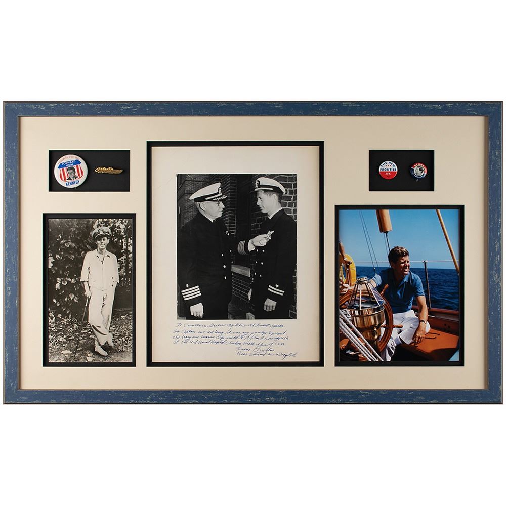 Vintage matte-finish 7.25 x 9 photo of Conklin presenting a young John F. Kennedy his medal for heroism after rescuing crew members of PT-109, and affixed to a 10.5 x 13.5 mount, signed and inscribed on the mount in blue ink, "To Cornelius Greenway D. D. with kindest regards. As Captain MC US Navy it was my privilege to present the Navy and Marine Corps medal to Lt. John F. Kennedy USN at the US Naval Hospital Chelsea Mass on June 12, 1944. Fredric L. Conklin, Rear Admiral MC US Navy Ret." Impressively matted and framed with two images and four original JFK campaign pins (including a PT-109 pin) to an overall size of 31 x 19. In very good to fine condition, with creasing to the upper left and lower left corners on the mount.