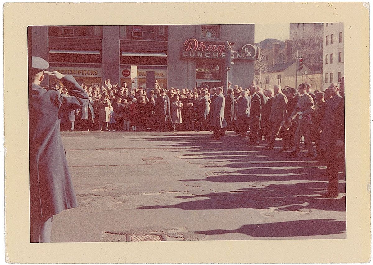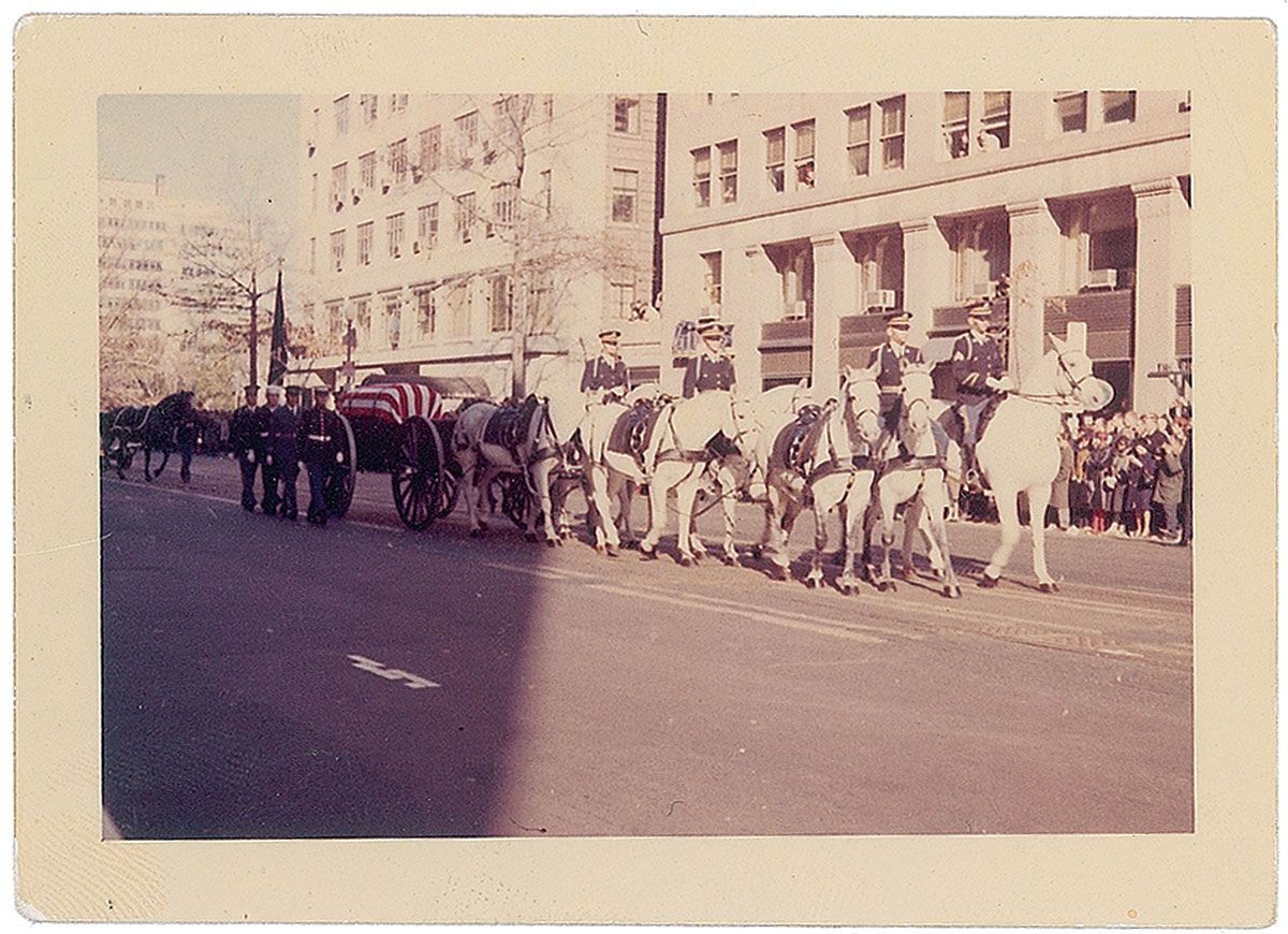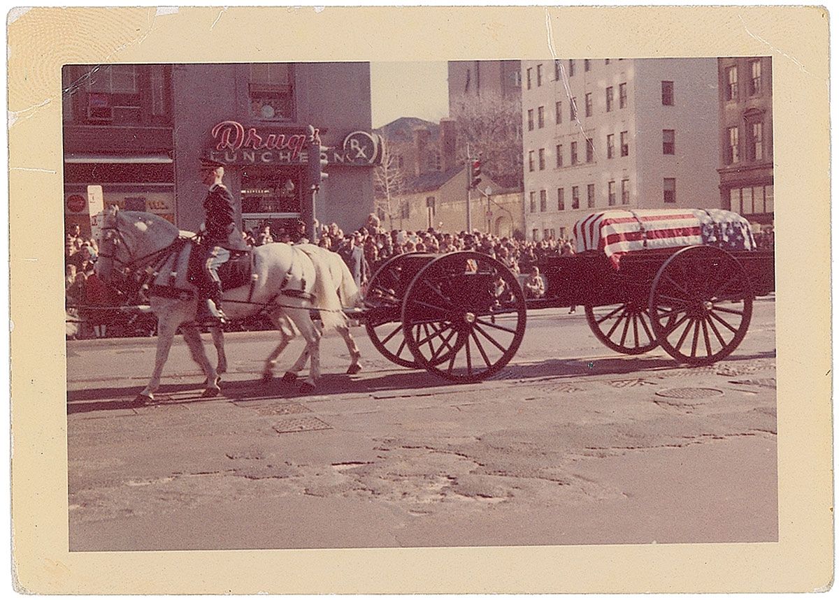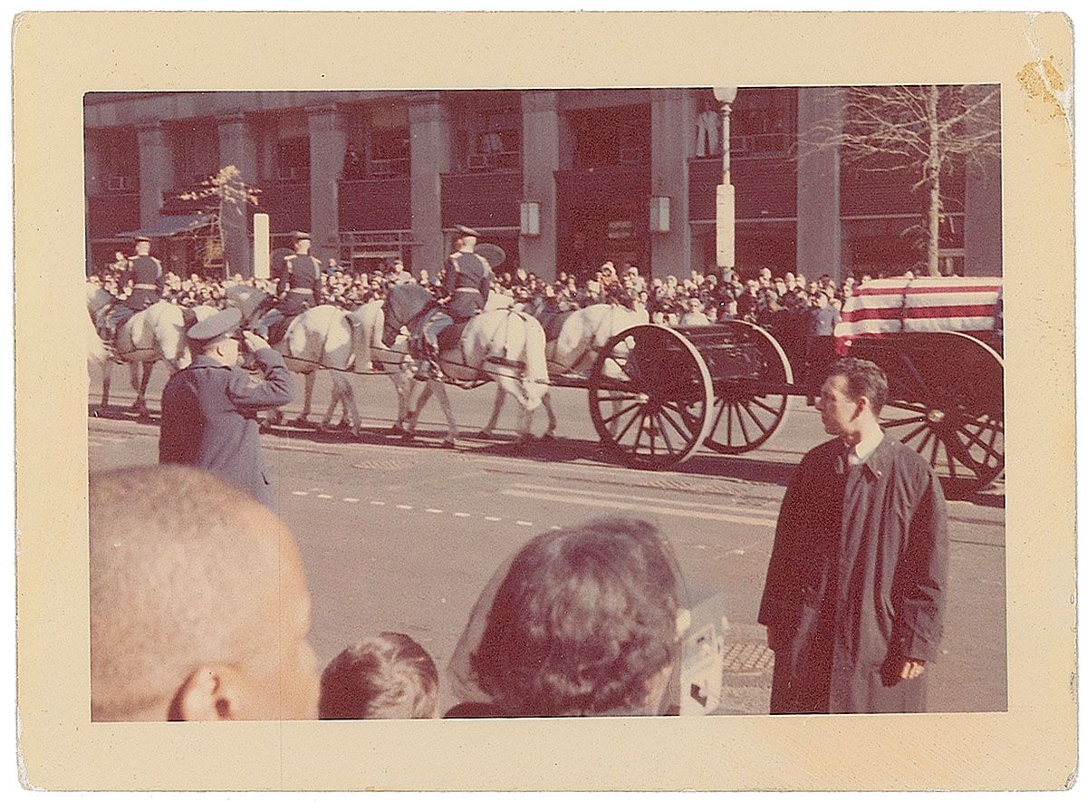 Five vintage color glossy 3.5 x 2.5 snapshot photos of JFK’s funeral procession, three of the horse-drawn caisson carrying Kennedy’s flag-draped coffin and two of the general procession. In overall fine condition, with corner creases to a couple photos.