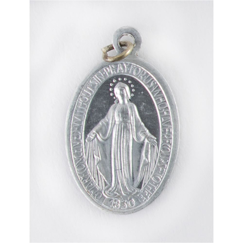 Lovely Italian-made silver-tone Virgin Misericordia (Virgin of Mercy) religious medal gifted to John and Jacqueline Kennedy upon the birth of their son John F. Kennedy, Jr. The pendant, .5 x .75, bears a divine image of the Virgin Mary encircled by prayer text, with reverse featuring a raised symbol of the Marian cross. In fine condition.