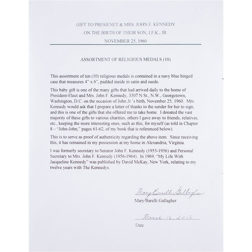 Accompanied by a photocopied letter of provenance from Mary Barelli Gallagher, originally written for a set of 10 religious medals, in part: "This baby gift is one of the many gifts that had arrived daily to the home of President-Elect and Mrs. John F. Kennedy, 3307 N St., N.W., Georgetown, Washington, D.C. on the occasion of John Jr.'s birth, November 25, 1960. Mrs. Kennedy would ask that I prepare a letter of thanks to the sender for her to sign, and this is one of the gifts that she offered me to take home. I donated the vast majority of these gifts to various charities, others I gave away to friends, relatives, etc., keeping the more interesting ones, such as this, for myself." Provenance: Collection of Mary Barelli Gallagher, Bonhams, 2017. Barelli was secretary to Senator John F. Kennedy from 1953–1956, and personal secretary to Jackie Kennedy from 1956–1964.
