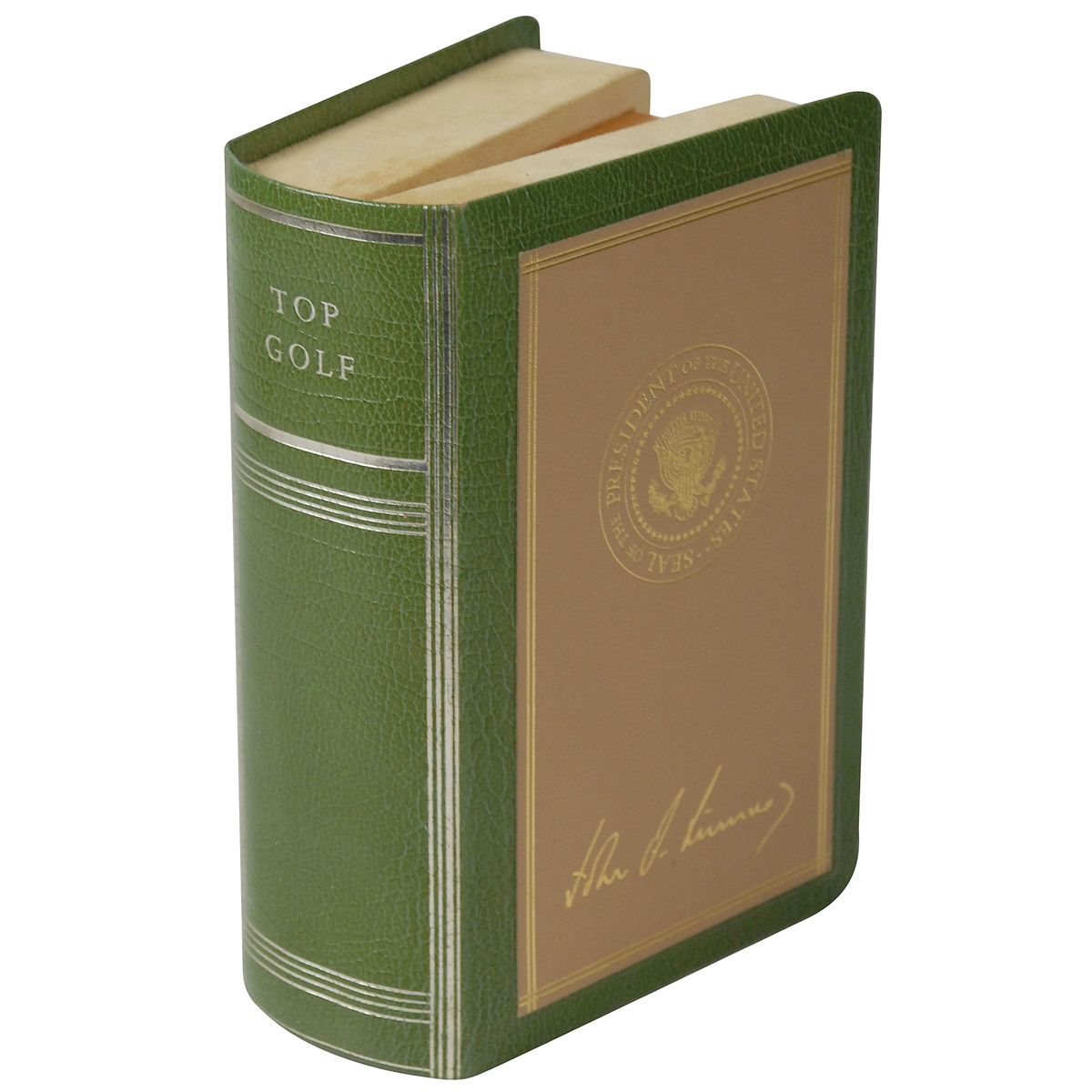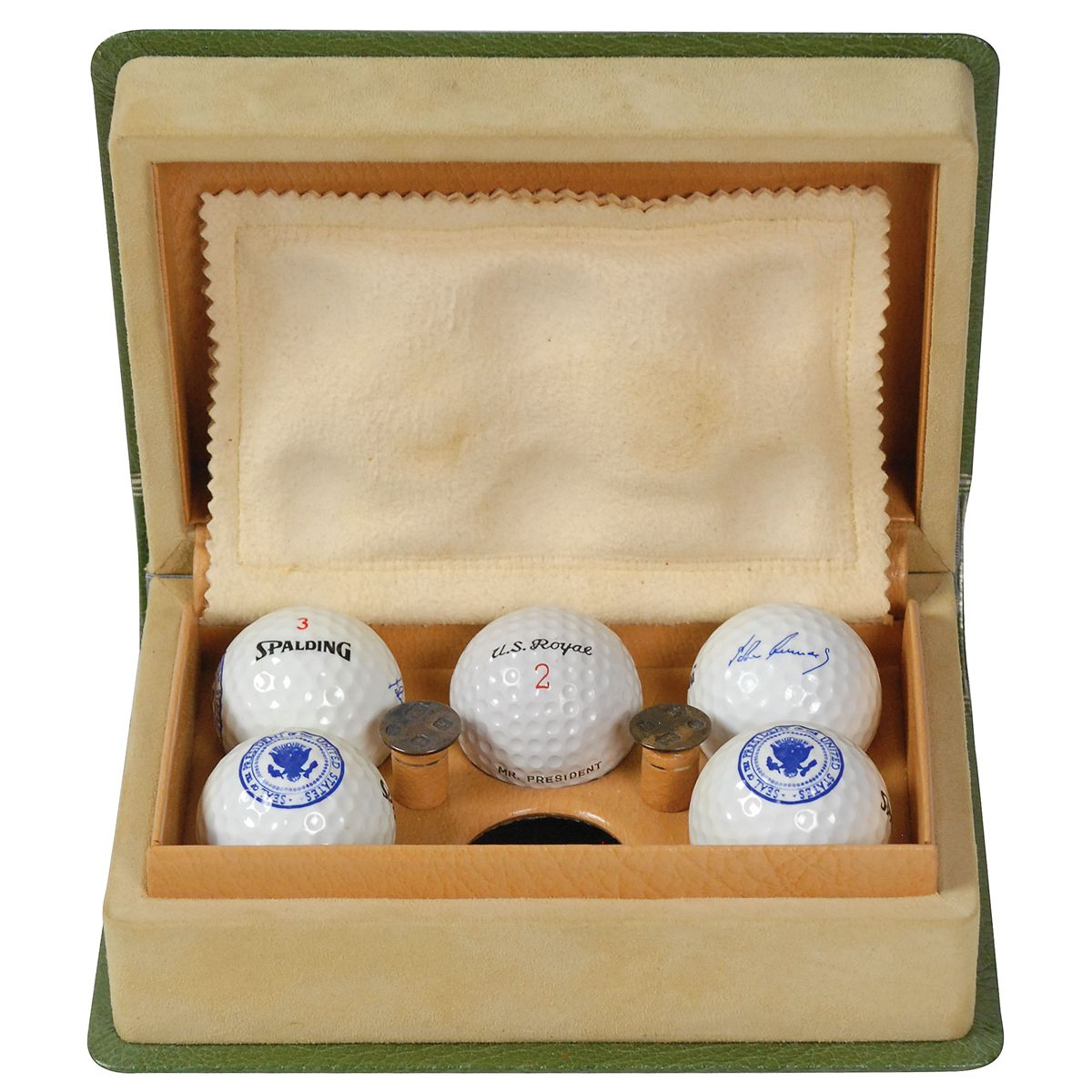 Set of five presidential golf balls presented in a special green and brown leather case resembling a book, gilt stamped on the front with the presidential seal and Kennedy’s facsimile signature. The spine of the case reads, “Top Golf,” and its interior is lined with supple leather and suede padding. The most important golf ball, marked “U. S. Royal 2 Special,” is of a simple style, with one side featuring the text “Mr. President” in plain type; this ball, not a part of the original set, is said to have been hit by President Kennedy, in the presence of White House photographer Cecil Stoughton. Three of the golf balls are branded “Spalding 3” and feature blue images of the presidential seal on one side and Kennedy’s facsimile signature on the other side. The fifth golf ball is essentially identical, but marked “Spalding 4.” In overall fine condition, with some light marks and toning to a few golf balls. These specially made presidential sets were only presented to a select few. Additional provenance information will be made available online at rrauction.com.