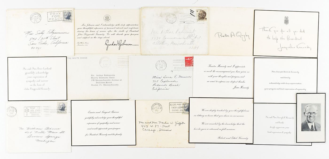 Uncommon assemblage of seven ‘appreciation’ or ‘thank you’ cards sent to well wishers following the death of President John F. Kennedy on November 22, 1963, with all but one of the cards sent by a member of the Kennedy family, including: Jacqueline Kennedy, bearing a preprinted message addressed to “Burton A. Quigley,” with the original secretarially signed envelope; Lyndon and Lady Bird Johnson, bearing a preprinted signature of the president, with White House mailing envelope postmarked December 2, 1963; Joseph and Rose Kennedy, with hand-addressed mailing envelope postmarked December 23, 1963; Robert and Ethel Kennedy, with hand-addressed mailing envelope postmarked January 11, 1964; Joan Kennedy on behalf of her husband Senator Ted Kennedy; Peter Lawford and Patricia Kennedy, with hand-addressed mailing envelope postmarked December 23, 1963; and Eunice and Sargent Shriver, with hand-addressed mailing envelope postmarked January 14, 1964. Also includes an ‘appreciation’ card from Rose Kennedy in regard to the recent passing of her husband, Joseph P. Kennedy, with hand-addressed mailing envelope postmarked January 1970, and a laminated prayer card from the funeral service. In overall fine condition.