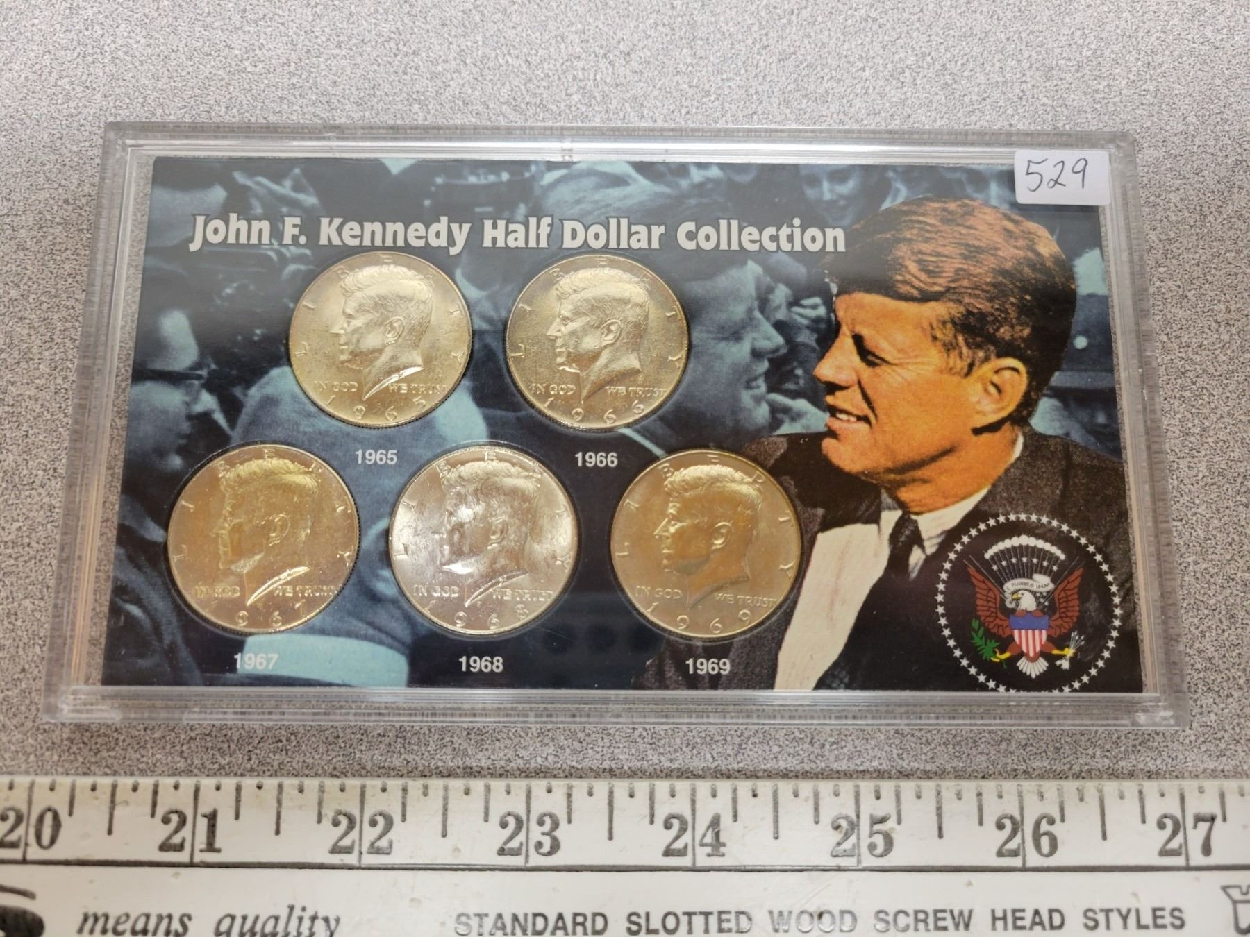 John F. Kennedy Half Dollar Collection. Set of 5 Silver Clad coins from 1965 to 1969. Housed in a hard plastic holder.