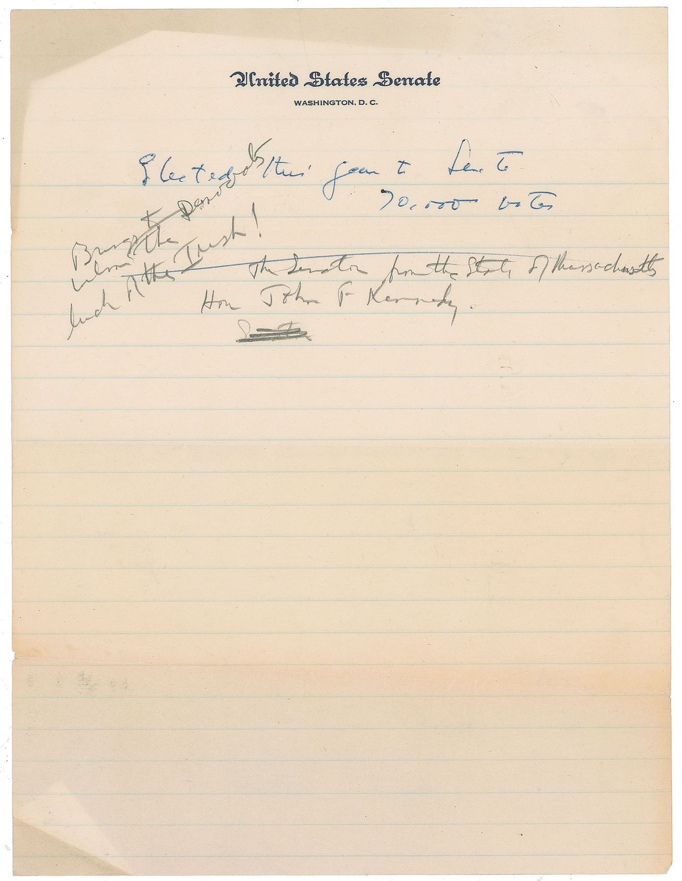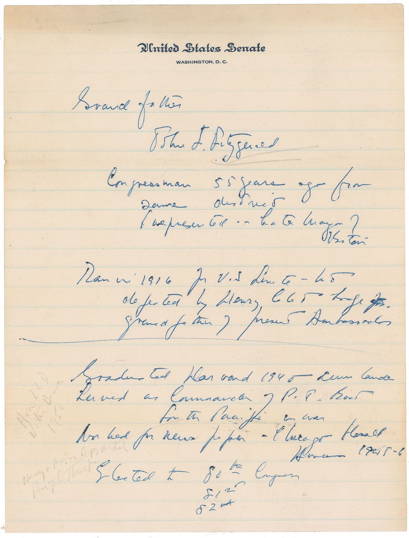 Highly appealing collection of unsigned handwritten notes from John F. Kennedy as a Massachusetts Senator, consisting of a genealogical outline of his family history, as well as his own personal accomplishments, two pages, circa 1953, United States Senate letterhead. These notes were prepared to aid Alexis Irenee du Pont Bayard, Lieutenant Governor of Delaware, who was introducing Kennedy before an audience. Kennedy's notes, in part: “Grandfather John F. Fitzgerald, Congressman 55 years ago from same district I represented…later Mayor of Boston. / Ran in 1916 for U.S. Senate—but defeated by Henry Cabot Lodge, grandfather of present ambassador. / Graduated Harvard 1940 cum laude. Served as Commander of P. T. Boat for the Pacific in war. Worked for newspaper—Chicago herald American 1945-6 [where Kennedy covered the United Nations Conference in San Francisco and the elections that ousted Winston Churchill in 1945 from London]. Elected to 80th, 81st, 82nd Congress. Elected this year to Senate, 70,000 votes.” Bayard adds some notes in pencil at the conclusion of the second sheet. Also included is Bayard’s handwritten manuscript summary. In fine condition, with light edge toning.