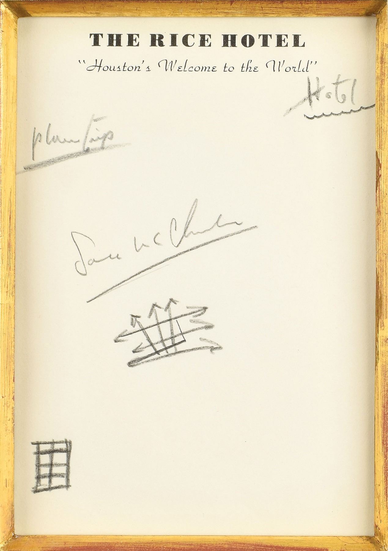 Handwritten notes and doodles by John F. Kennedy from the night before his assassination, November 21, 1963, accomplished in pencil on two sheets of 4 x 5.5 stationery from the Rice Hotel in Houston, Texas. Jotting down notes, probably while on the telephone, Kennedy writes, "Talk with Bob & Harley," "Jackie," "Dan," "7879," and "8:00," on one sheet, and "plane trip," "Hotel," and "Sarah McClendon" on the other, and sketches a few grids and arrows. Below, a phone number is written in another hand: "Dallas, Dc 8-7573." Attractively archivally cloth-matted and framed with an image of the Kennedys at Love Field in Dallas prior to the assassination, as well as a printed description, to an overall size of 28 x 22.5. Provenance: Retained among the papers of his personal secretary, Evelyn Lincoln, and sold at Christie's in 1997.