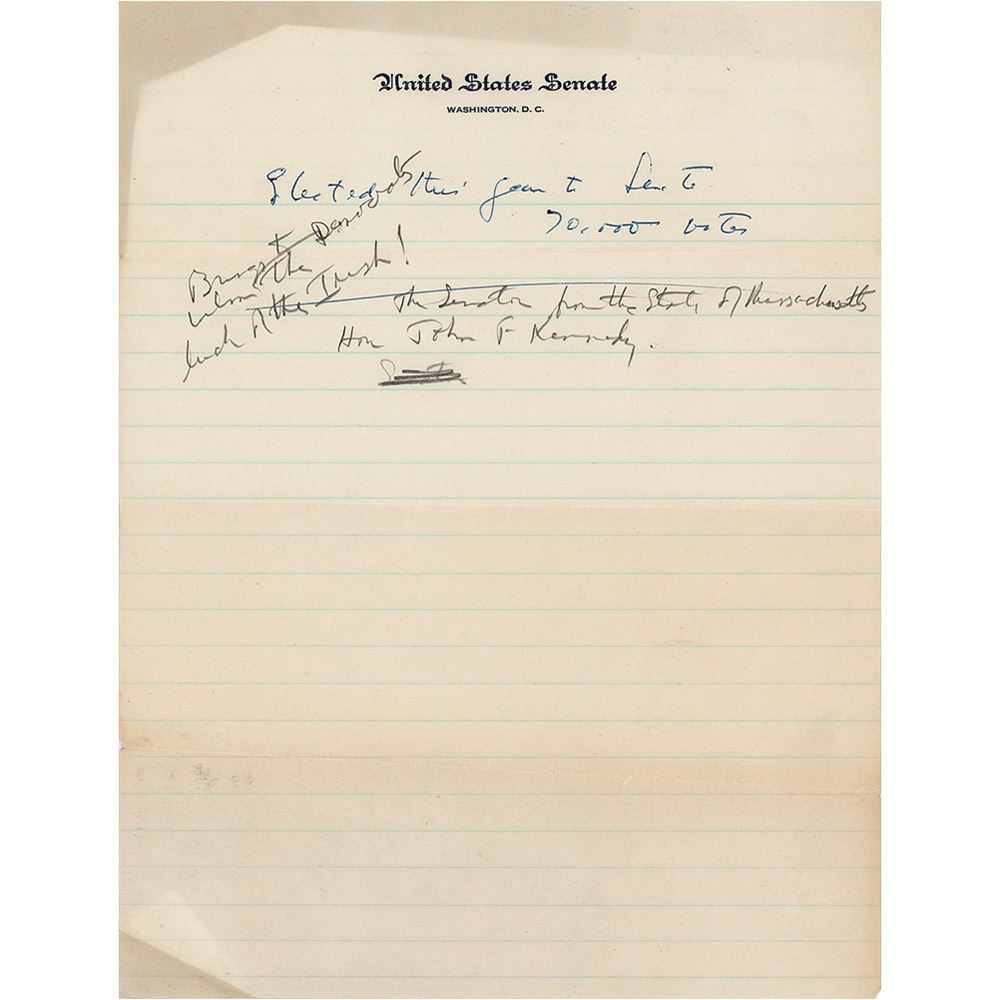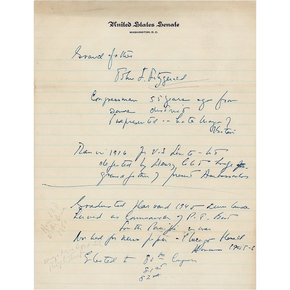 Highly appealing collection of unsigned handwritten notes from John F. Kennedy as a Massachusetts Senator, consisting of a genealogical outline of his family history, as well as his own personal accomplishments, two pages, circa 1953, United States Senate letterhead. These notes were prepared to aid Alexis Irenee du Pont Bayard, Lieutenant Governor of Delaware, who was introducing Kennedy before an audience. Kennedy's notes, in part: “Grandfather John F. Fitzgerald, Congressman 55 years ago from same district I represented…later Mayor of Boston. / Ran in 1916 for U.S. Senate—but defeated by Henry Cabot Lodge, grandfather of present ambassador. / Graduated Harvard 1940 cum laude. Served as Commander of P. T. Boat for the Pacific in war. Worked for newspaper—Chicago herald American 1945-6 [where Kennedy covered the United Nations Conference in San Francisco and the elections that ousted Winston Churchill in 1945 from London]. Elected to 80th, 81st, 82nd Congress. Elected this year to Senate, 70,000 votes.” Bayard adds some notes in pencil at the conclusion of the second sheet. Also included is Bayard’s handwritten manuscript summary. In fine condition, with light edge toning.