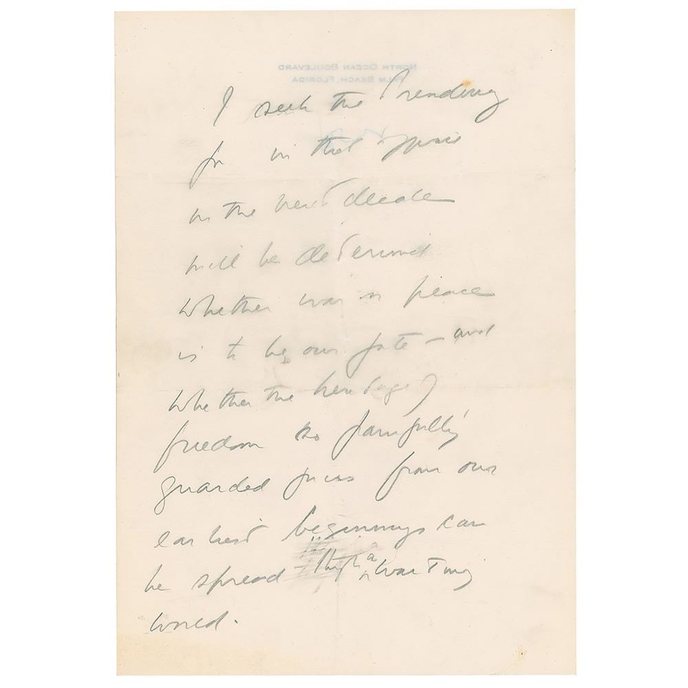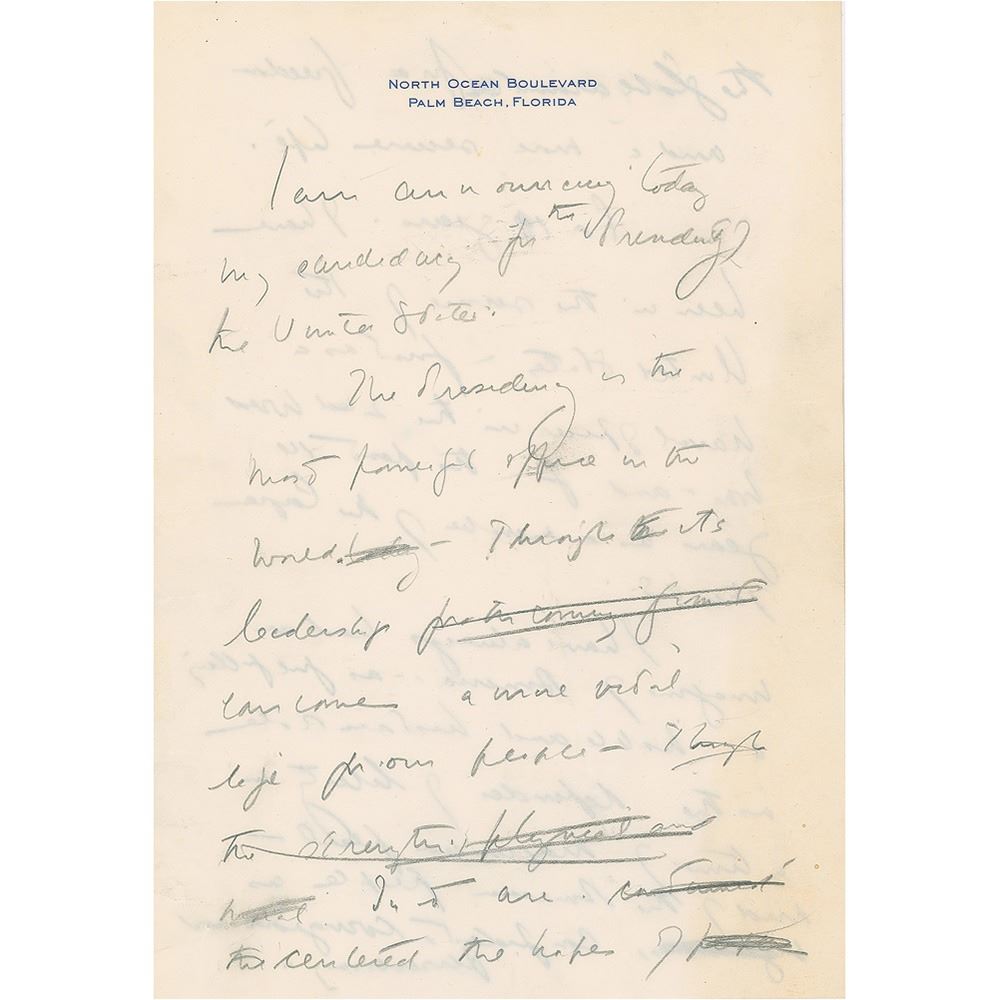 JFK’s original 3-page handwritten draft for his speech, announcing his intention to run for the Presidency in 1960. JFK writes on North Ocean Boulevard Palm Beach, Florida stationary, also included three additional typed pages with JFK annotated revisions, as well as a third draft of two typed pages with additional JFK hand revisions including the famous line that ended this announcement, "It is with this image that I begin this campaign."
