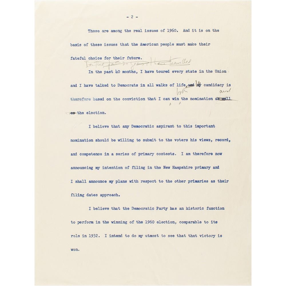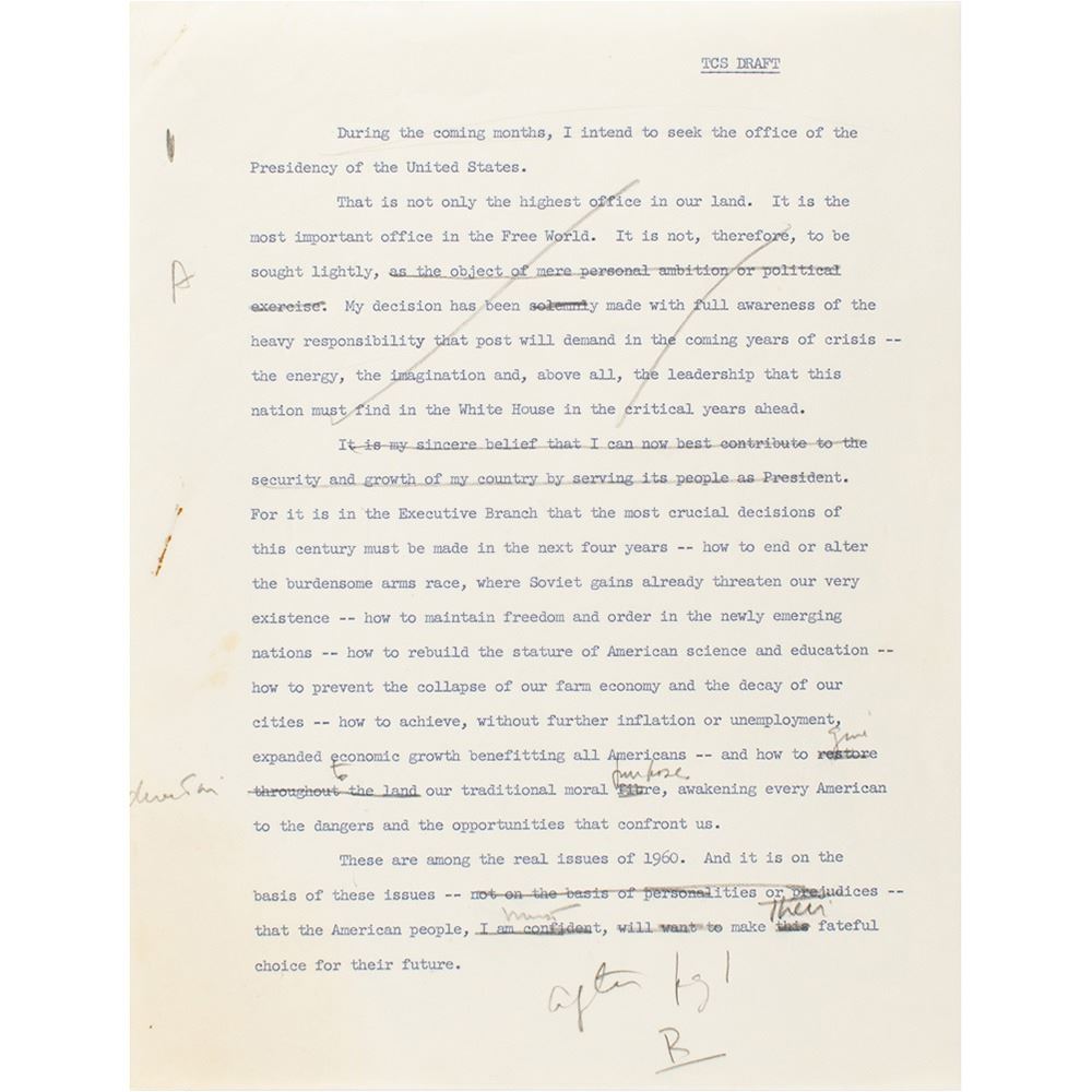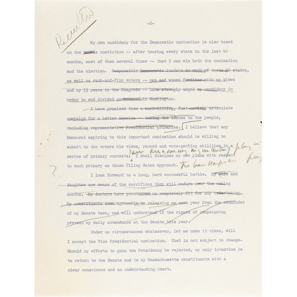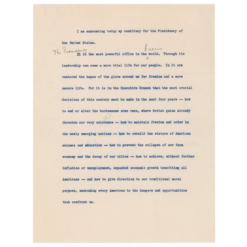 An extraordinary and historically significant John F. Kennedy artifact: "I am announcing today my candidacy for the Presidency of the United States."