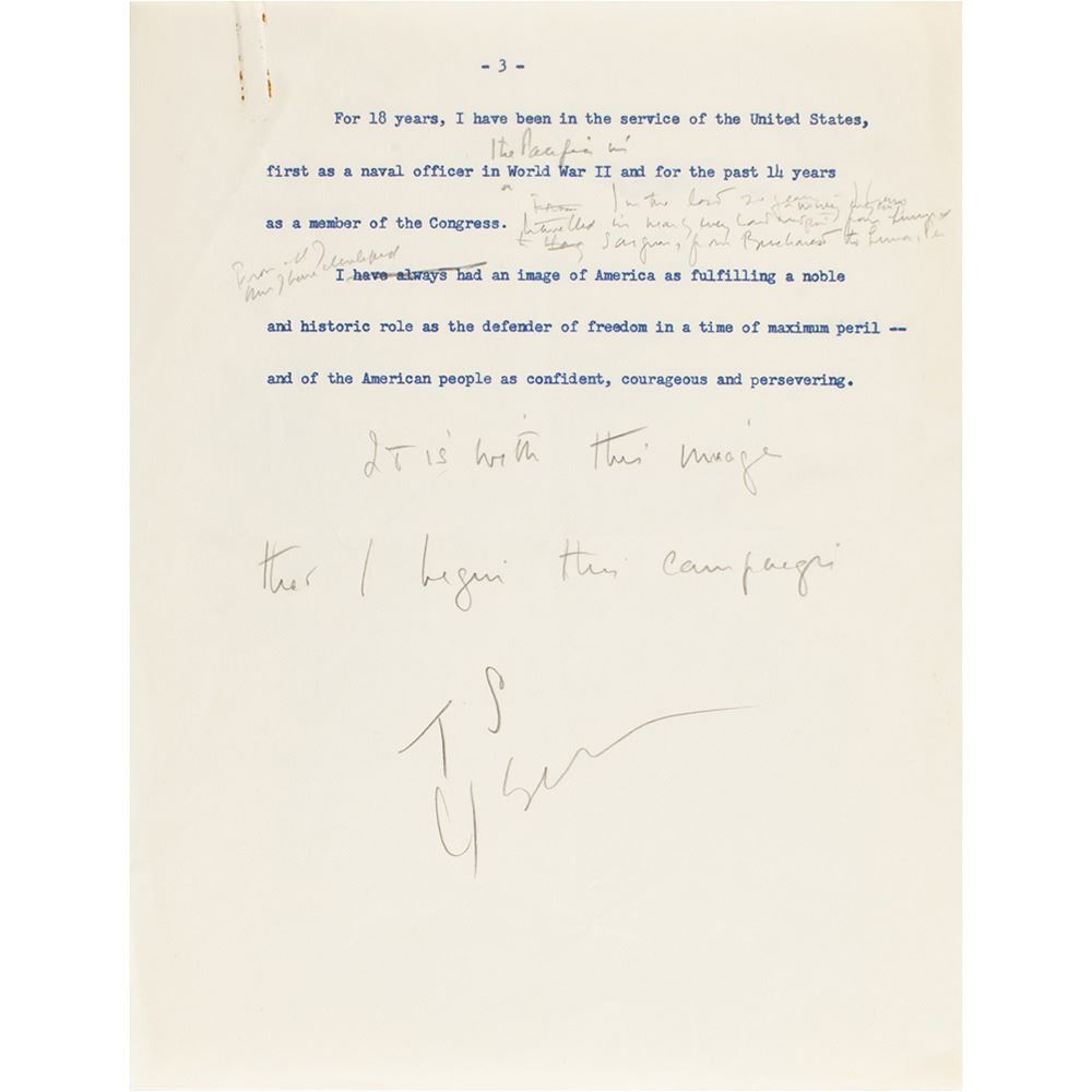 Kennedy's revisions and corrections appear on the additional typed drafts, including his famous closing line: "It is with this image that I begin this campaign."
