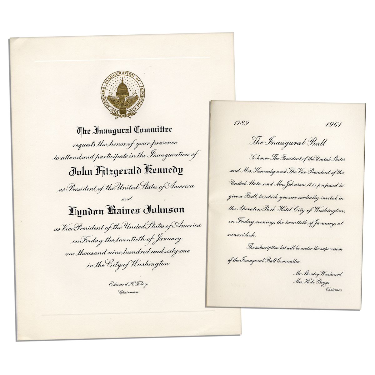 Invitation to John F. Kennedy inauguration, accompanied by the invitation to the inaugural ball. Printed invitation with gilt seal at top reads, ''The Inaugural Committee requests the honor of your presence to attend and participate in the Inauguration of John Fitzgerald Kennedy as President of the United States and Lyndon Baines Johnson as Vice President of the United States of America on Friday the twentieth of January one thousand nine hundred and sixty-one in the City of Washington / Edward H. Foley / Chairman''. Measures 8.5'' x 11.25'' on a sheet of card-style paper. Near fine condition. Accompanied by an invitation to the Inaugural Ball on 20 January 1961. Ball invitation measures 5.75'' x 7.75''. Crease through center, else near fine. Also included is a single-page printed schedule of inaugural events and a pristine Inaugural Committee envelope.