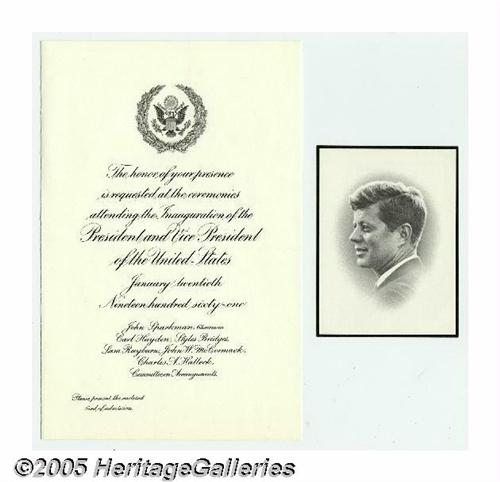 <B>John F. Kennedy Inaugural Invitation and Funeral Mass Card</B></I> 6.5" x 10" engraved invitation to the inauguration of John F. Kennedy on January 20, 1961. Sold together with a 3.5" x 4.75" black-bordered funeral mass card issued to mourners attending his memorial service at Washington's National Cathedral. Both items are in excellent condition. Lot:264