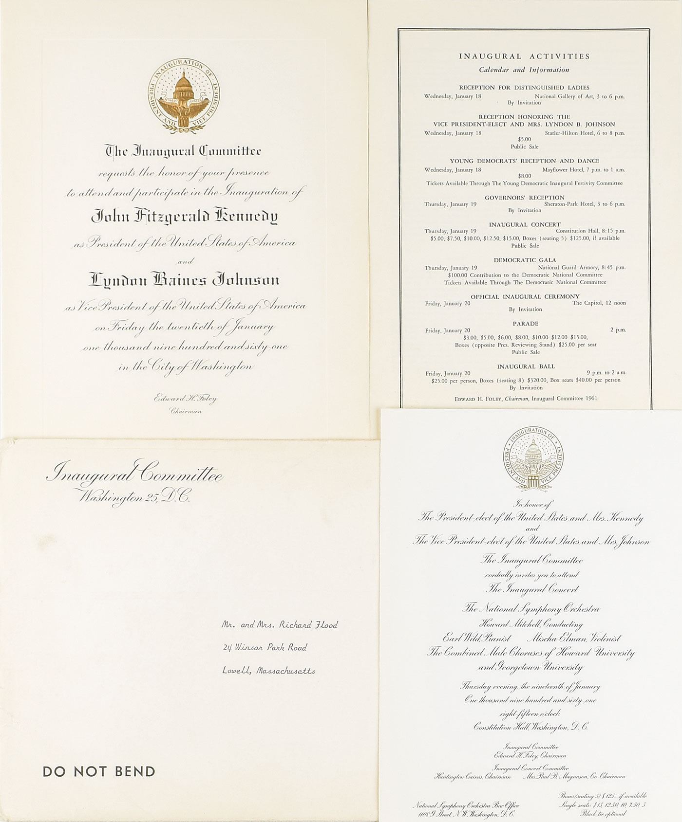 Official invitation to the inauguration of President John F. Kennedy on January 20, 1961, sent to Kennedy family friend Richard R. Flood. Includes the invitation to the inauguration ceremony, the invitation to the inaugural concert at Constitution Hall, and schedule of events, as well as the original mailing envelope. In fine condition.