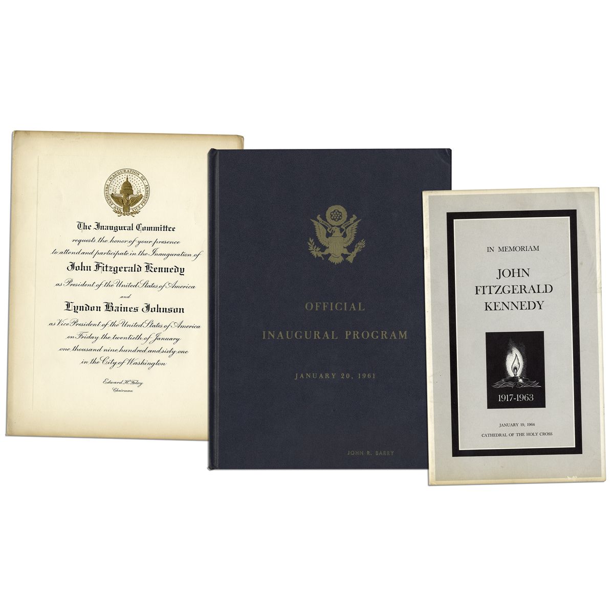 John F. Kennedy inaugural lot. Three piece lot comprises: (1) invitation to the 20 January 1961 inauguration of JFK and his Vice President Lyndon B. Johnson, with gilt seal. On card-style paper measuring 8.5'' x 11''. Toning, else near fine, (2) Limited DeLuxe Edition of the inaugural program, #298. Photo-illustrated program is signed by the Chairman of the Inaugural Committee on the front pastedown, which also serves as the limitation page. Runs 31pp. Bound in navy blue cloth boards. Measures 8.5'' x 11''. Toning and interior front hinge is detached, else near fine, (3) program from the post-assassination Solemn Pontifical Mass of Requiem officiated by Cardinal Cushing, Archbishop of Boston, held at the Cathedral of the Holy Cross. Runs 14pp. Measures 6.5'' x 11''. Light toning and some abrasions to covers, else near fine.