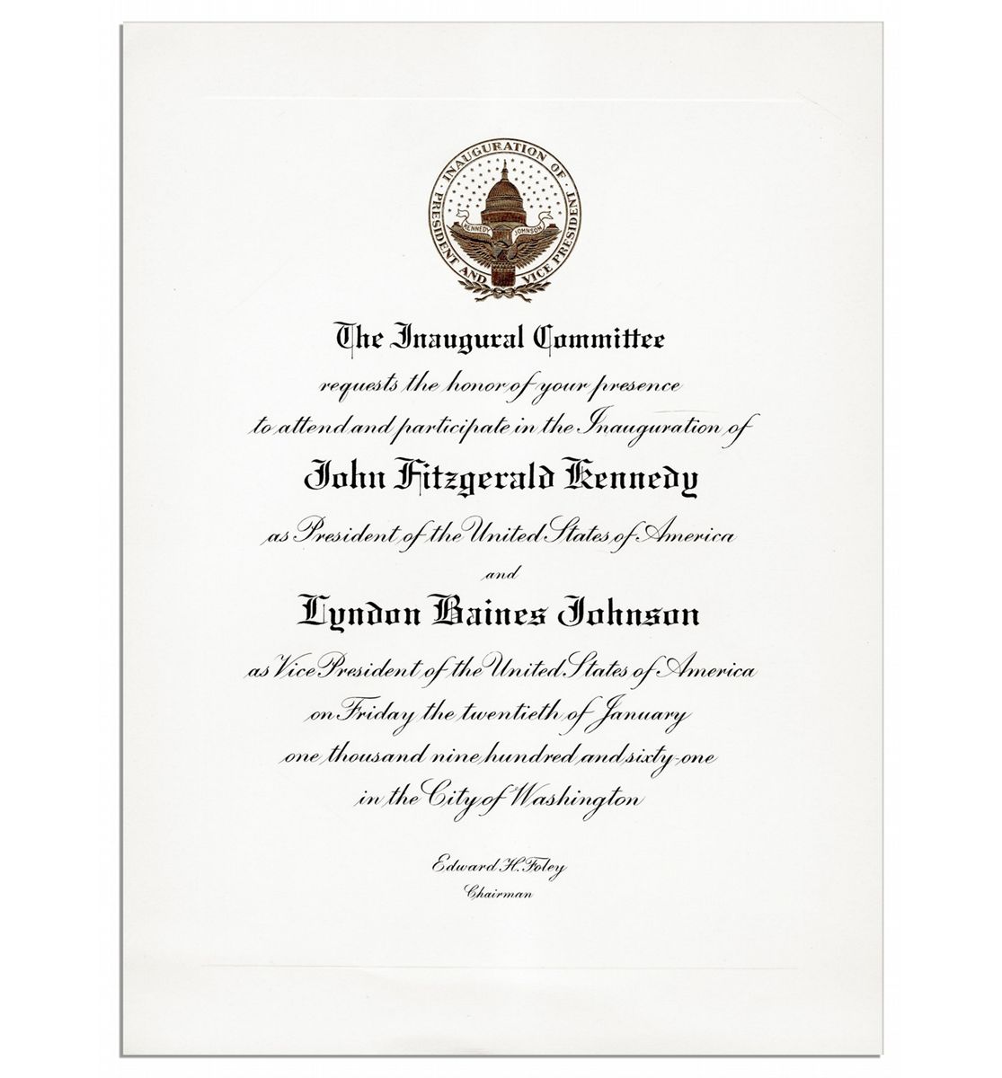 Invitation to the first day of the nation's beloved Camelot era, the 20 January 1961 Inauguration of President John F. Kennedy. Beneath a gold seal, printed text reads: ''The Inaugural Committee requests the honor of your presence to attend and participate in the Inauguration of John Fitzgerald Kennedy as President of the United States of America on Friday the twentieth of January...in the city of Washington Edward H. Foley / Chairman''. Original envelope is included. 1pp. printed on card-style stationery measures 8.5'' x 11.25''. Fine.
