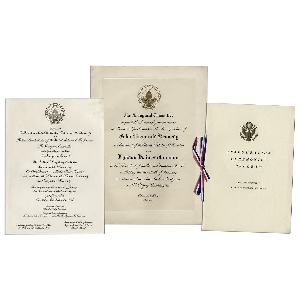 Invitation and program to the first day of the nation's beloved Camelot era, the 20 January 1961 Inauguration of President John F. Kennedy. Accompanied by an invitation to the inaugural concert the night before. Beneath a gilt seal, printed text of the inaugural invitation reads: ''The Inaugural Committee requests the honor of your presence to attend and participate in the Inauguration of John Fitzgerald Kennedy as President of the United States of America...on Friday the twentieth of January...''. 1pp. on card-style stationery measures 8.5'' x 11.25''. Program runs 4pp. and features a gilt seal to the top; bound with a red, white and blue striped ribbon. Measures 6.25'' x 9''. Concert invitation runs 1pp. Measures 7'' x 9.75''. Toning to inaugural invitation and tape to verso. Concert invitation shows tape and pencil notation to verso and faint staining to upper right. Very good overall with program in near fine condition.