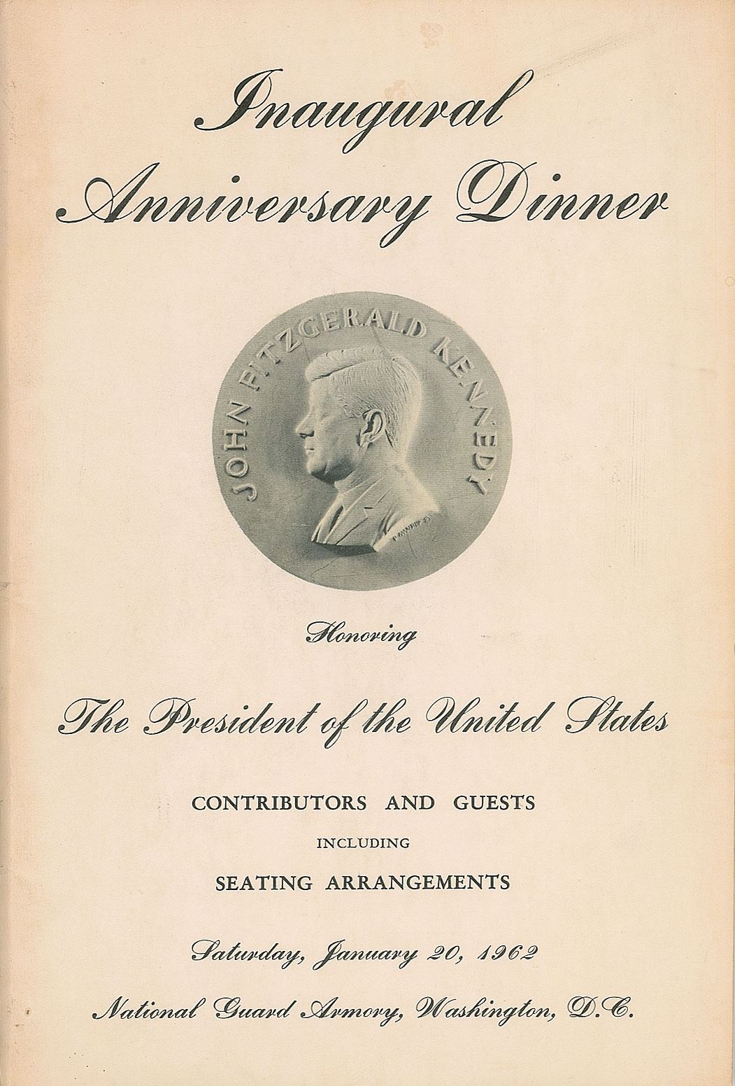 Program and ticket for the "Inaugural Anniversary Dinner" honoring JFK held at the National Guard Armory in Washington, DC, on January 20, 1962. The program provides the contributor and guest list, as well as seating arrangements for those in attendance. In fine condition.