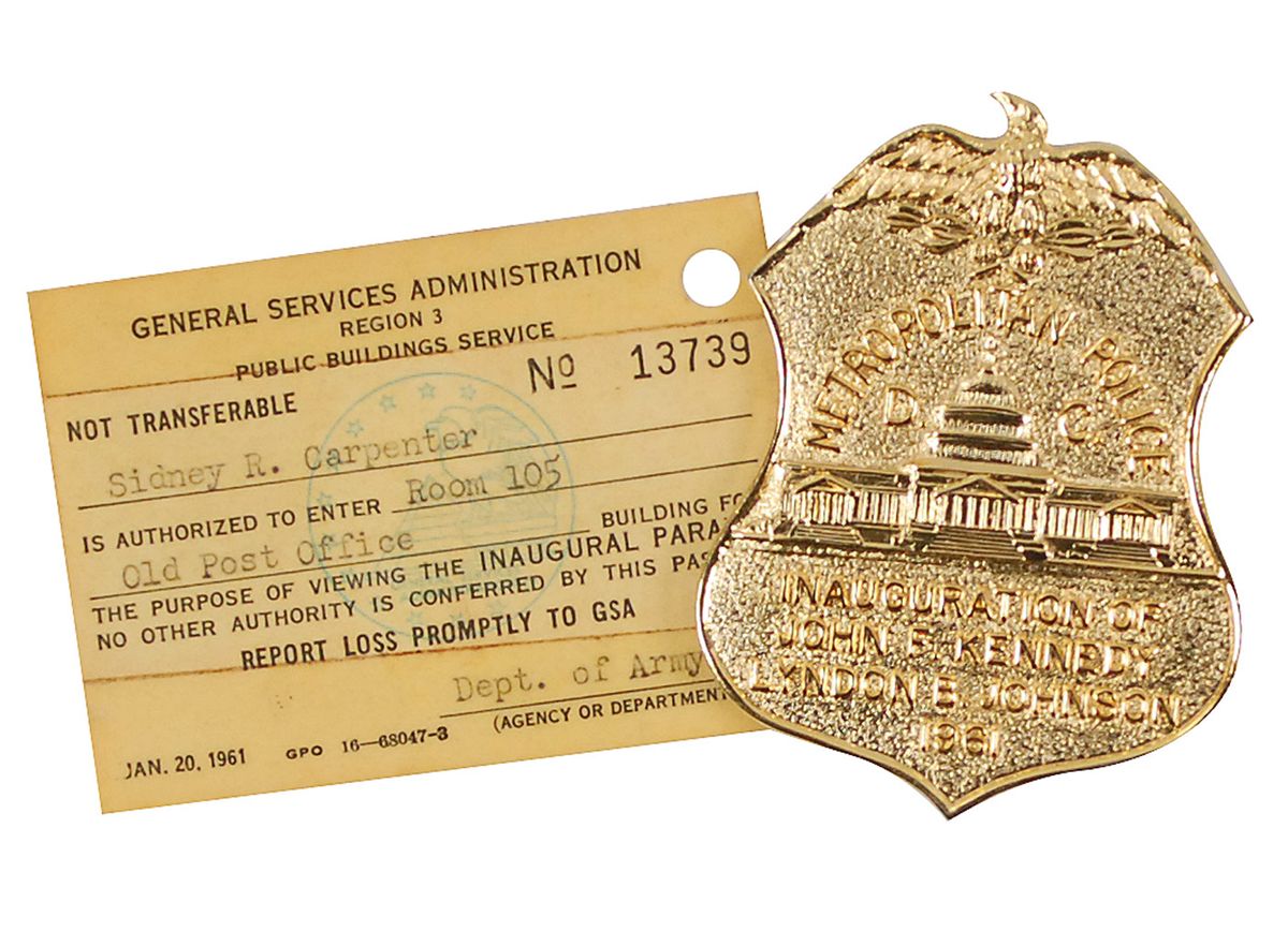 Two items: rare official Metropolitan Police special-issue brass badge for Kennedy's inauguration on January 20, 1961, measuring approximately 2.25 x 3, reading: "Metropolitan Police / D. C. / Inauguration of / John F. Kennedy / Lyndon B. Johnson / 1961." Shield-shaped badge design is topped with an eagle and features an image of the US Capitol in high relief. Reverse bears a pin and clasp fastener. Also includes a rare General Services Administration Public Building Service pass, number 13739, 3 x 2.25, authorizing Sidney R. Carpenter to enter "Room 105, Old Post Office building for the purpose of viewing the Inaugural Parade. No other authority is conferred by this pass." Due to the small size of the viewing area, only individuals of significant military or civilian GSA rank were given these passes, making them quite rare. Badge is in very fine condition; pass is in very good condition, with moderate overall toning, toned tape affixed to top and bottom, and a punch hole to upper right corner. The consignor notes that his father was friends with John Layton, chief of the Washington police, who gave the family a pair of these badges as mementos of the day. The Metropolitan Police began issuing these special inauguration badges in 1937, which marked FDR's second inaugural event, and the tradition has continued to the present day; these badges in general are in limited supply and prized by collectors, with the 1961 version being one of the most desirable.