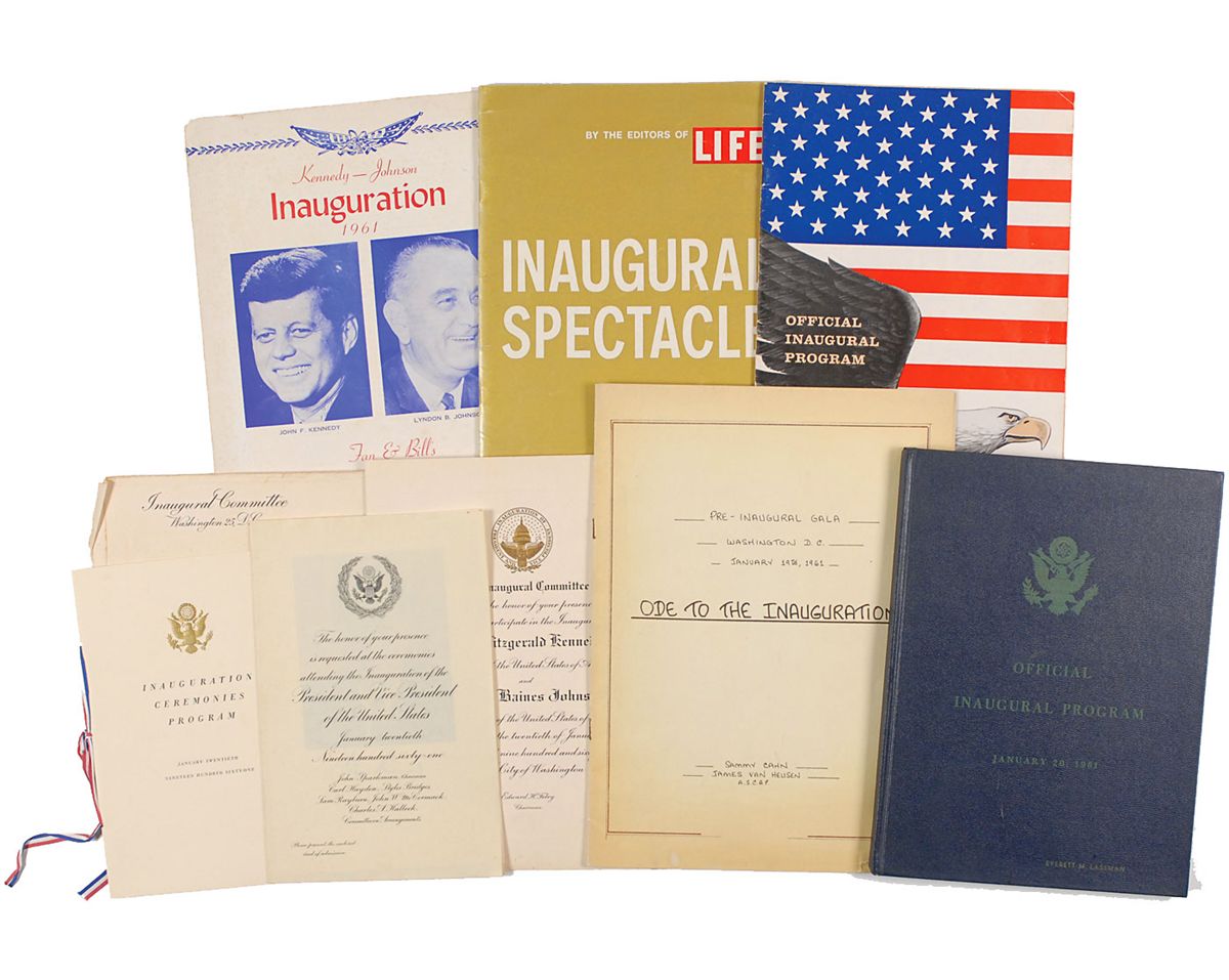 Collection of materials related to JFK’s inauguration that once belonged to Milton Berle, including: a limited edition hardcover inaugural program; a copy of the handwritten sheet music for the ‘Ode to the Inauguration’ performed at the pre-inaugural gala by the likes of Sinatra, Berle, Belafonte, and Lawford; two different invitations with the original mailing envelopes; two different softcover programs; souvenir edition of Life magazine; and cardstock photo. In overall fine condition. Berle was closely connected to the Kennedy campaign, participating in fundraisers and performing at his Inaugural Gala, along with the likes of Frank Sinatra, Peter Lawford, and Ella Fitzgerald.