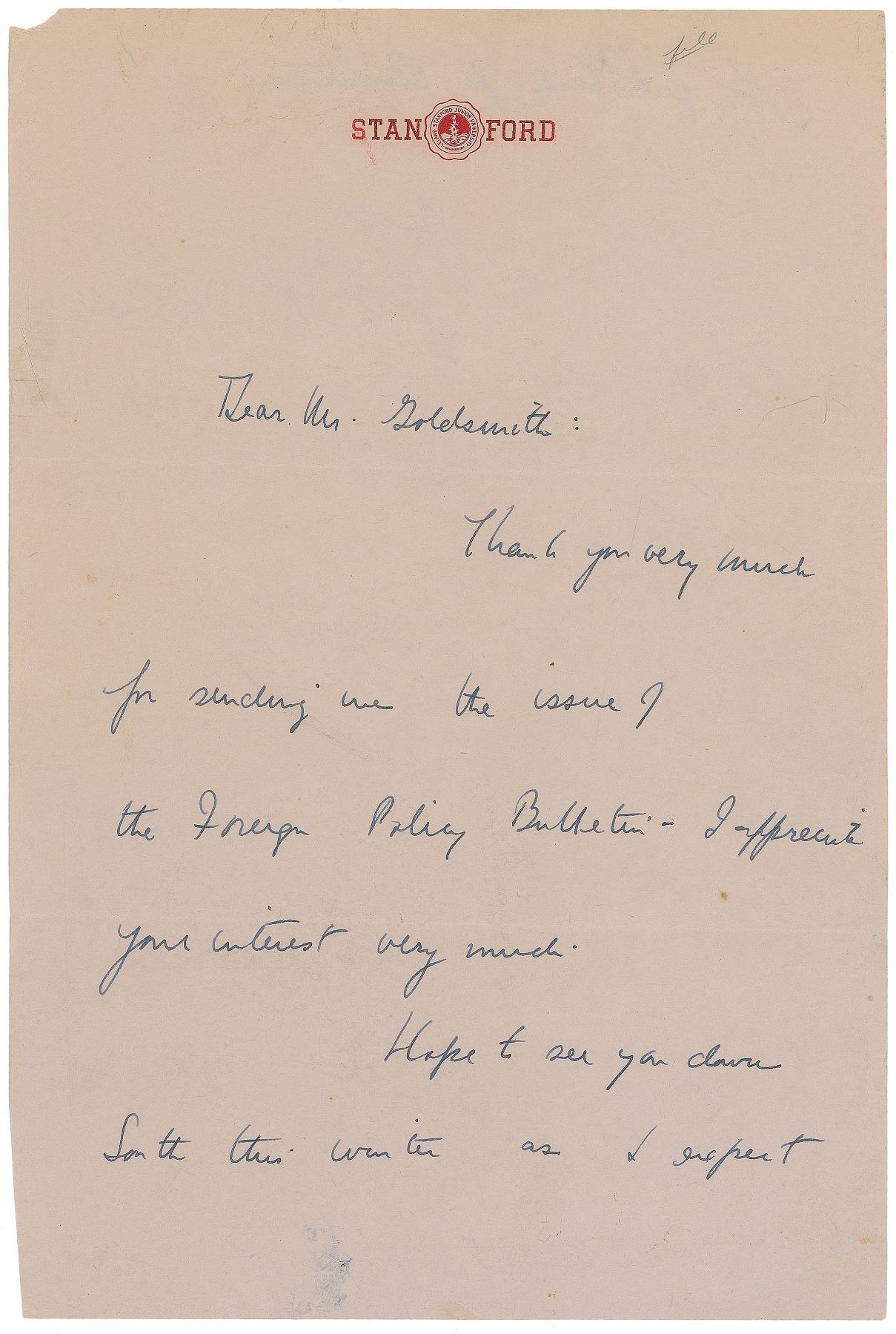 JACK KENNEDY WRITES TO MR. GOLDSMITH ON RARE STANFORD STATIONERY: Rare "Stanford" stationery ALS circa 1940 signed "Jack K." to Arthur Goldsmith, his stockbroker and Kennedy family friend. Kennedy was only at Stanford for a few months.
