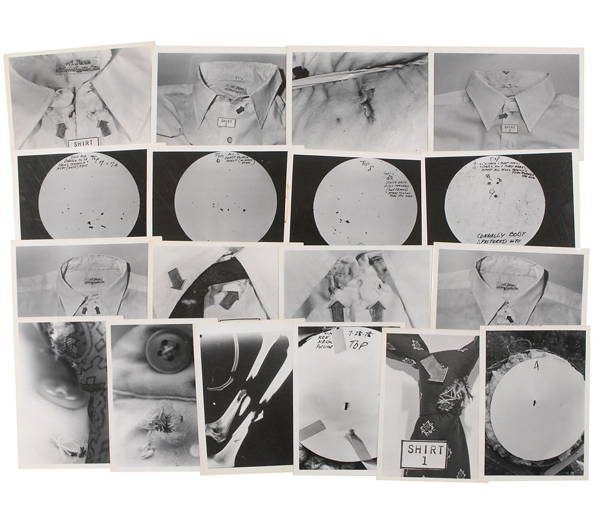 Collection of 18 original first generation glossy photos, all 7 x 5 and 5 x 7, of test results of experiments done by Dr. John K. Lattimer for his book Kennedy and Lincoln: Medical and Ballistic Comparisons of Their Assassinations. Photos show the results of test wounds fired through clothing, spatter results, an X-ray, and targets, all used by Lattimer to prove Oswald killed Kennedy. In fine condition. Lattimer fired countless rounds of similar ammunition through skulls with simulated brains as well as necks and bodies constructed of pork to simulate human skin. Highly important photos attempting to finally determine if Oswald acted alone.