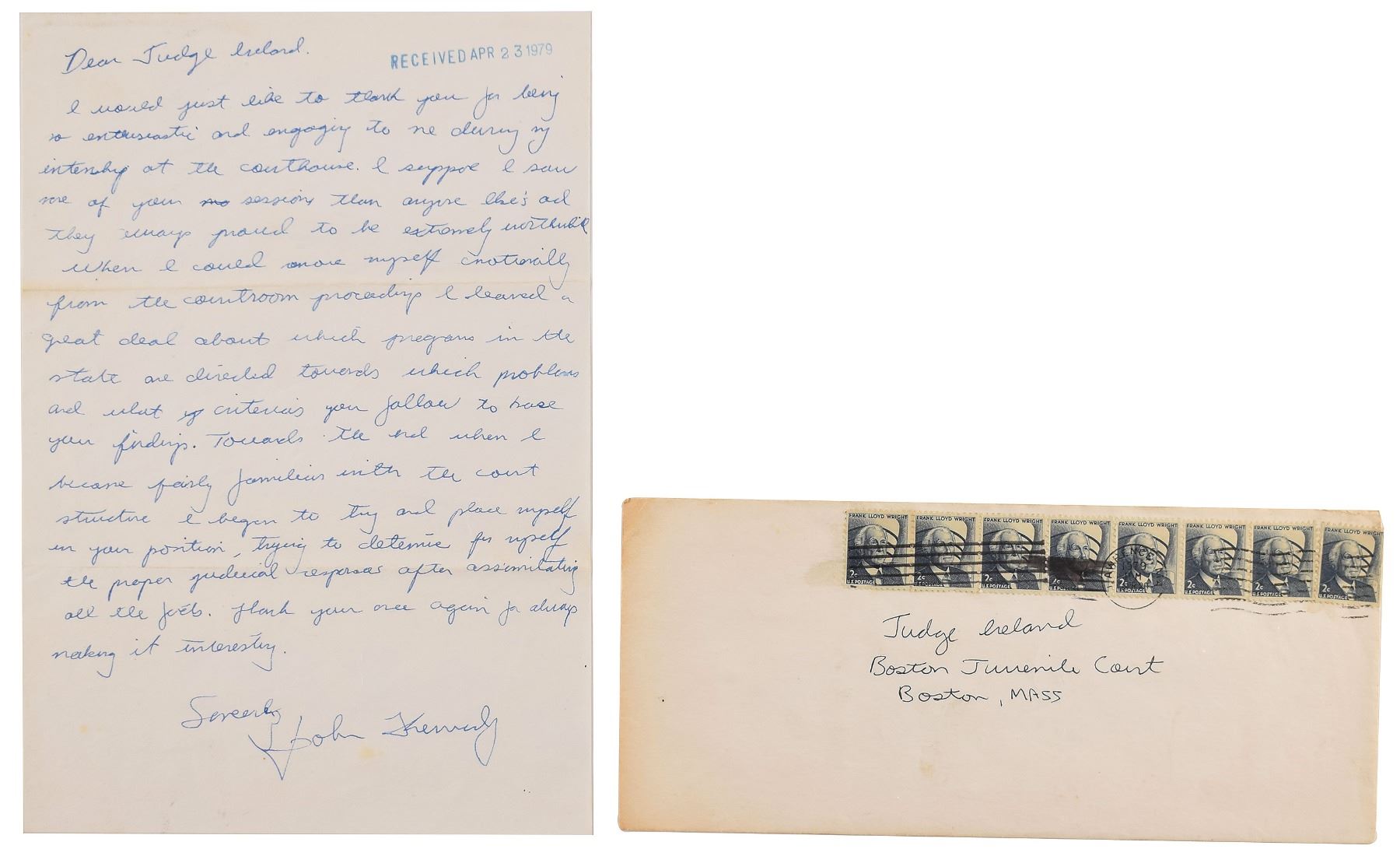 ALS signed “John Kennedy,” one page, 7.25 x 10.25, stamp-dated April 23, 1979. Letter to Judge Roderick L. Ireland, written as an 18-year-old intern in the Boston Juvenile Court system, in full: "I would just like to thank you for being so enthusiastic and engaging to me during my internship at the courthouse. I suppose I saw more of your sessions than anyone else's and they always proved to be extremely worthwhile. When I could move myself emotionally from the courtroom proceedings I learned a great deal about which programs in the state are directed towards which problems and what criterias you follow to base your findings. Towards the end when I became fairly familiar with the court structure I began to try and place myself in your position, trying to determine for myself the proper judicial responses after assimilating all the facts. Thank you once again for always making it interesting." In fine condition. Accompanied by the original mailing envelope, addressed in Kennedy's own hand.