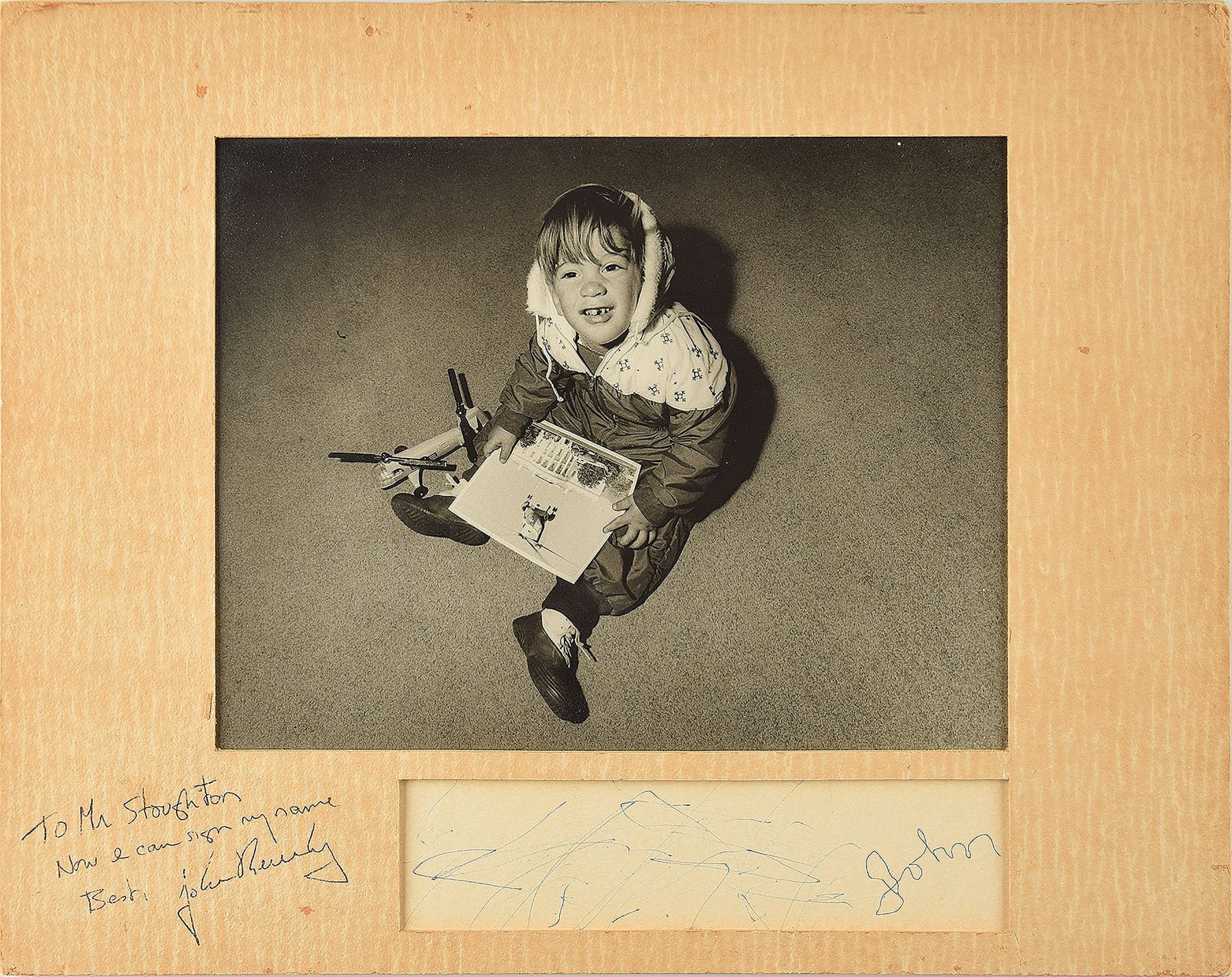 Cecil Stoughton photograph of young John Jr. with a scribble signature of John Jr. as a 2 year old, later inscribed to Mr. Stoughton from John Kennedy Jr. as an adult, "To Mr. Stoughton, Now I can sign my name, Best, John Kennedy." Charming portrait of young Kennedy showing his first tooth out smile playing with a toy helicopter and a picture of Marine One in the White House. Photo taken by first official White House photographer, Cecil W Stoughton who asked the boy to sign his name and hence the below scribble. Stoughton then helped the boy write "John". Some time in the 1990's, Stoughton and John Jr. found themselves at the same table at a NASA event in Florida. Stoughton asked John Jr. to re-inscribe this photo which he graciously did "To Mr. Stoughton, Now I can sign my name, Best, John Kennedy." Stamped on back by Stoughton. Unique piece from John Jr. who tragically died a few years after signing this photograph.