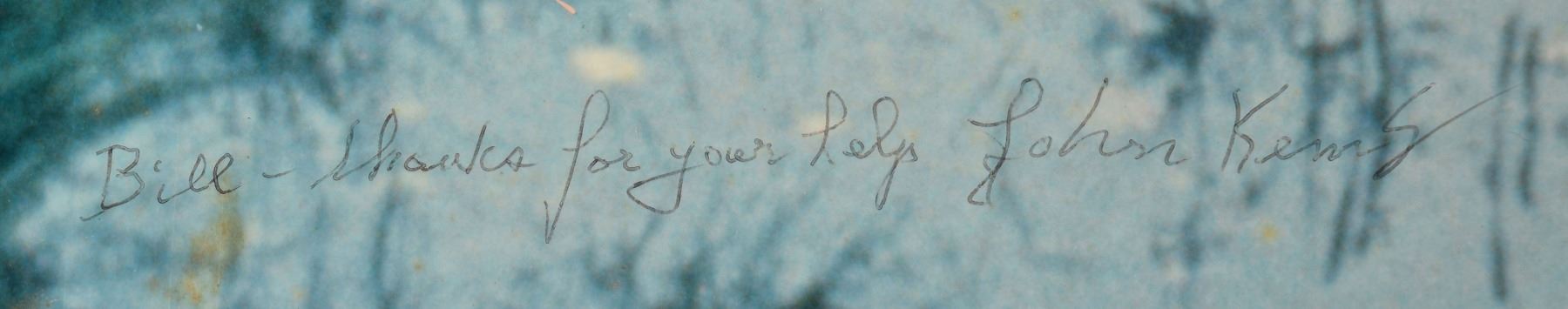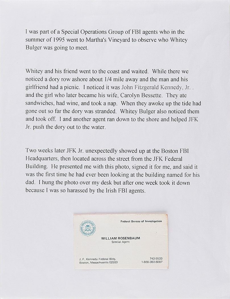 Oversized color photograph of John Jr. on Martha's Vineyard in 1995 taken by the FBI who were on a stakeout for Whitey Bulger and later inscribed by John Kennedy to FBI Special Agent William Rosenbaum, "Bill, thanks for your help, John Kennedy." Provenance: letter of explanation about this photograph from Special Agent William Rosenbaum with his FBI card. Incredible one of a kind FBI surveillance photograph of John Kennedy Jr. Letter and FBI card from Special Agent William Rosenbaum is included and explains the unusual set of circumstances of how and why this photographg was taken in the summer of 1995. The FBI was following up on a tip that Whitey Bulger was meeting somebody of interest to the FBI at Martha's Vineyard and from a distance the FBI spotted a man and a woman who they took pictures of that turned out to be John and his girlfriend and soon to be wife Carolyn Bessette having a picnic. Kennedy inscribed this framed oversized photograph (41" x 31") to Agent Rosenbaum who helped Kennedy push his dory out to the water.