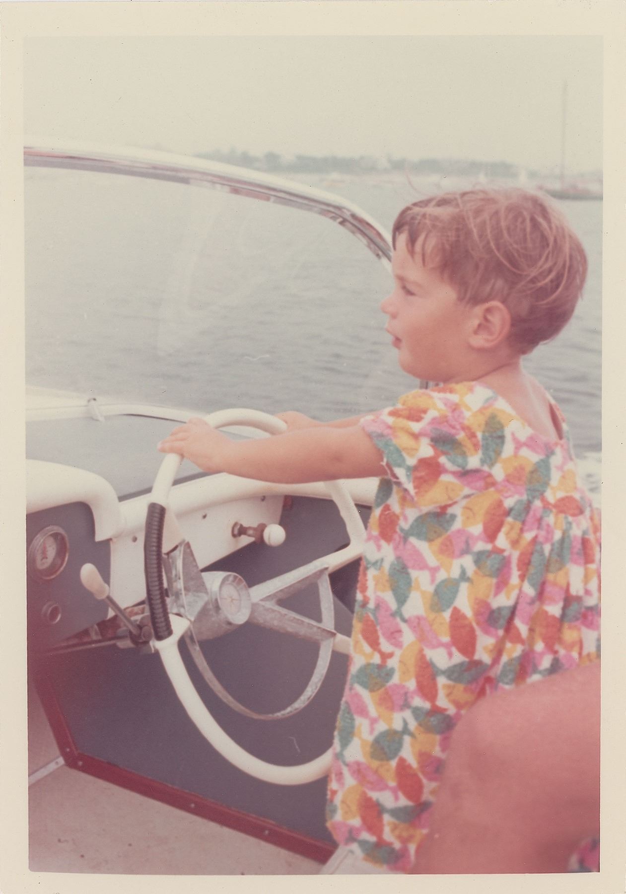 Cecil Stoughton's own original vintage color glossy 5 x 7 photo of John F. Kennedy, Jr., at the wheel of a speedboat off Hyannis Port on August 25, 1963, taken by official White House photographer Cecil W. Stoughton. Reverse bears "A Kodak Paper" watermarks and a ballpoint notation, "C281-41-63." In fine condition. From the collection of Cecil W. Stoughton.